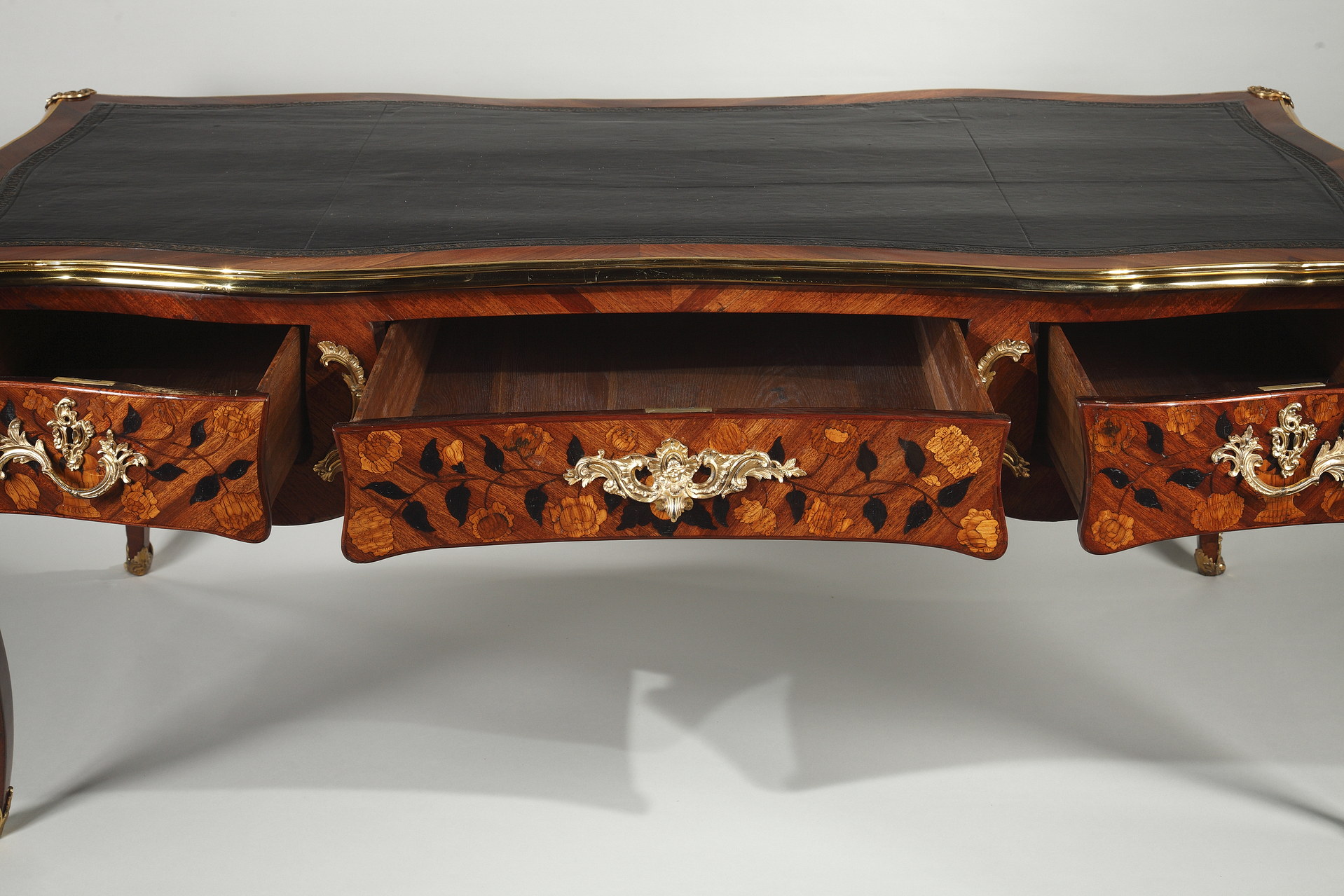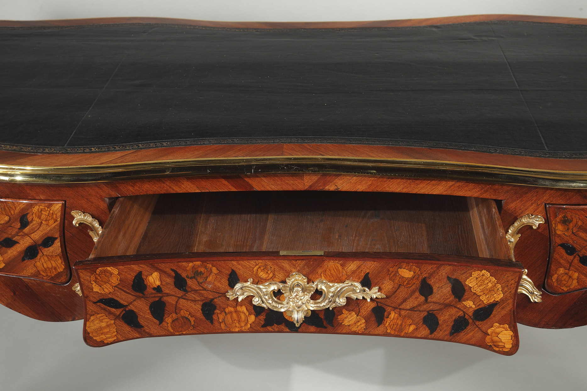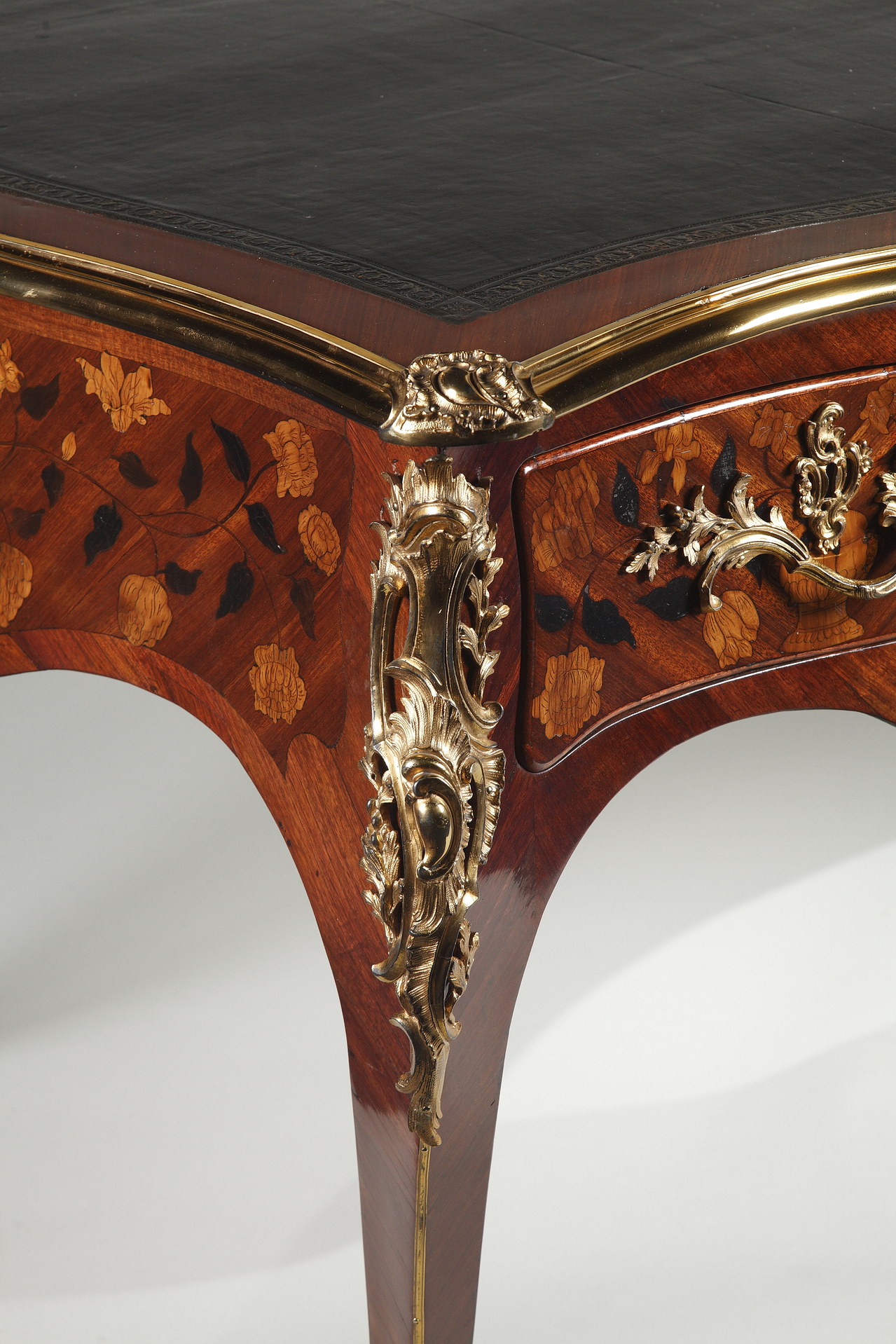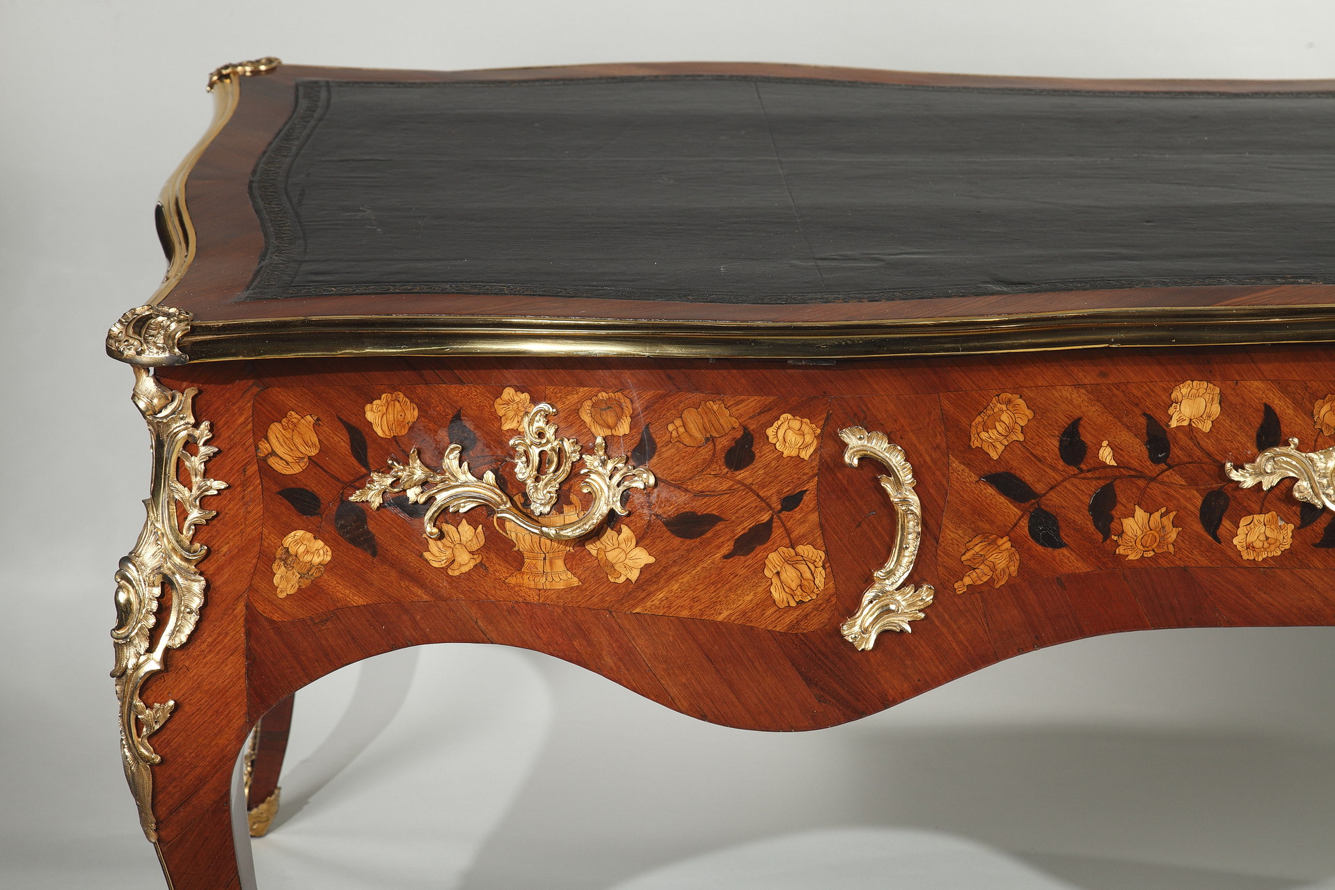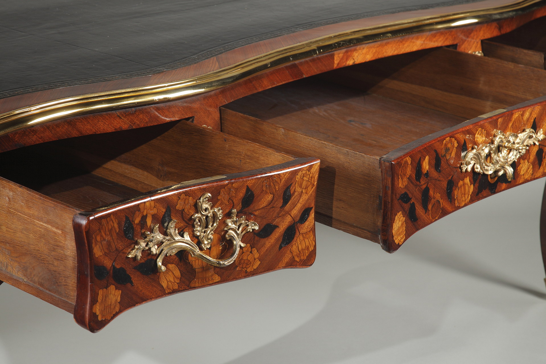 Riche garniture de bronze doré finement ciselé sur les chutes, entrées de serrures, poignées et sabots