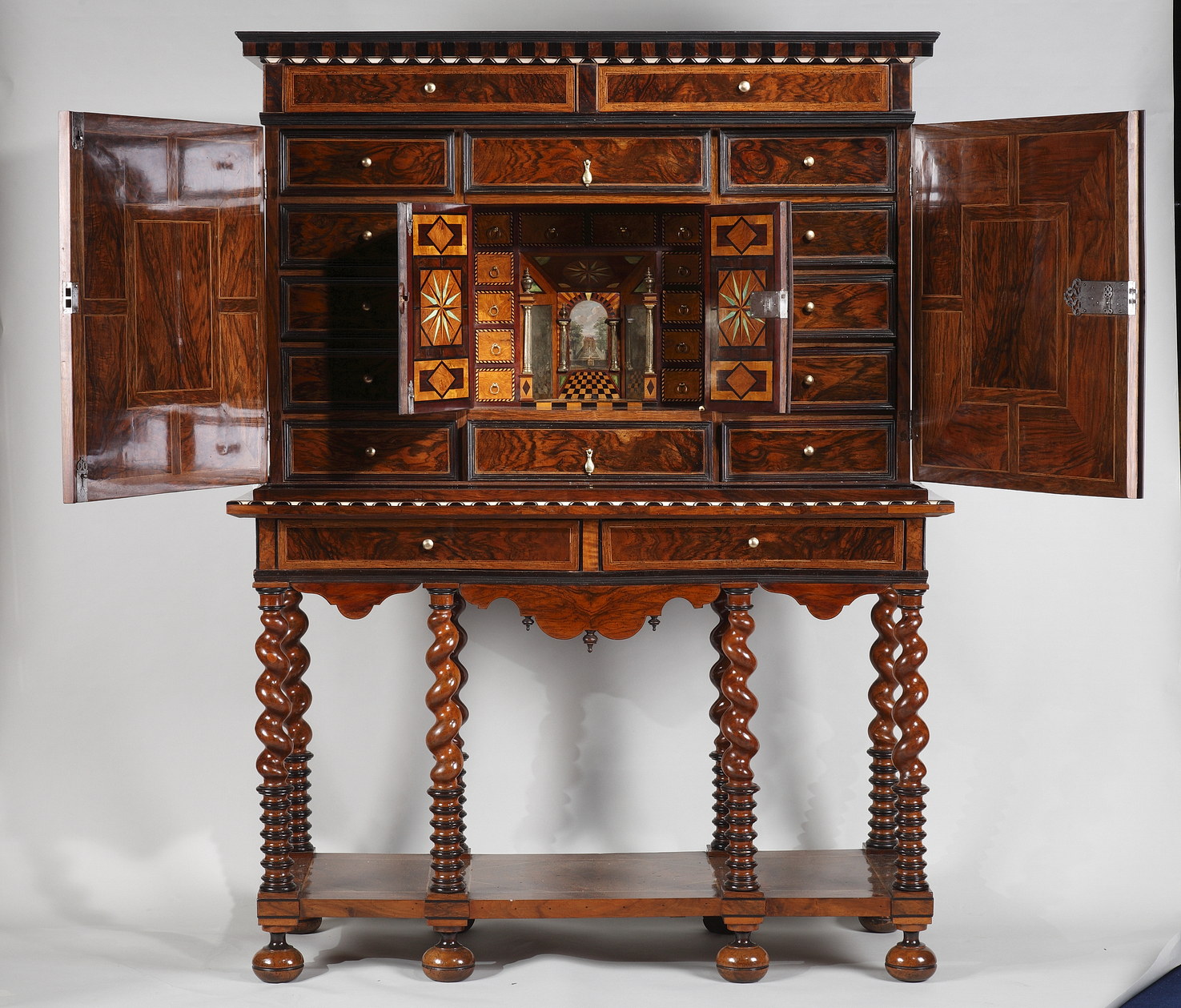 Il laisse découvrir 12 tiroirs et deux portes marquetées d’os qui présentent une perspective marquetée de cubes en trompe l’oeil, damier, rose des vents, motifs géométriques, miroirs et d’un château peint sur un panneau.