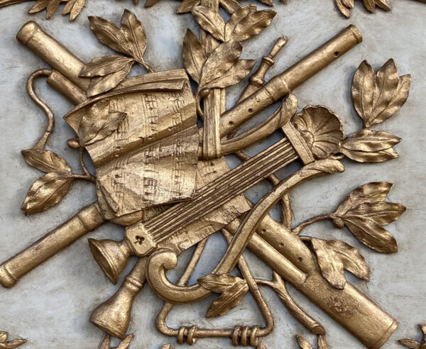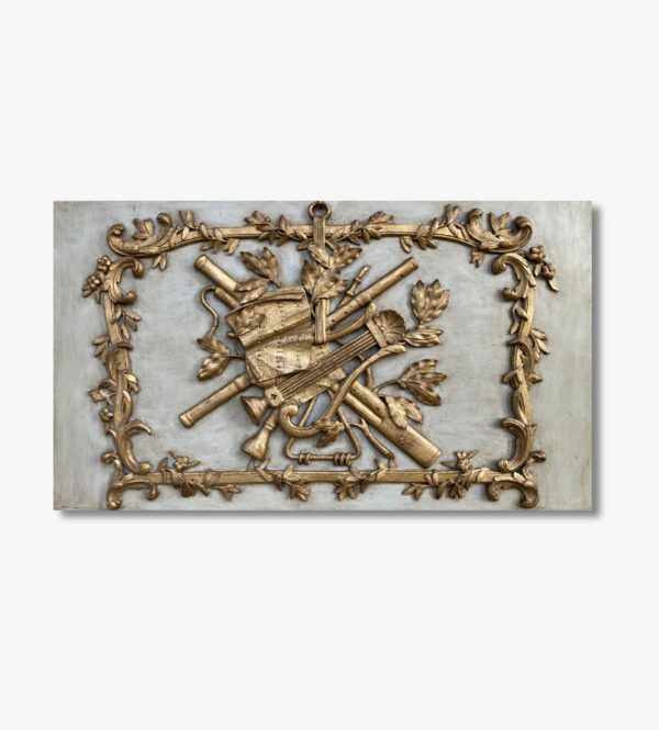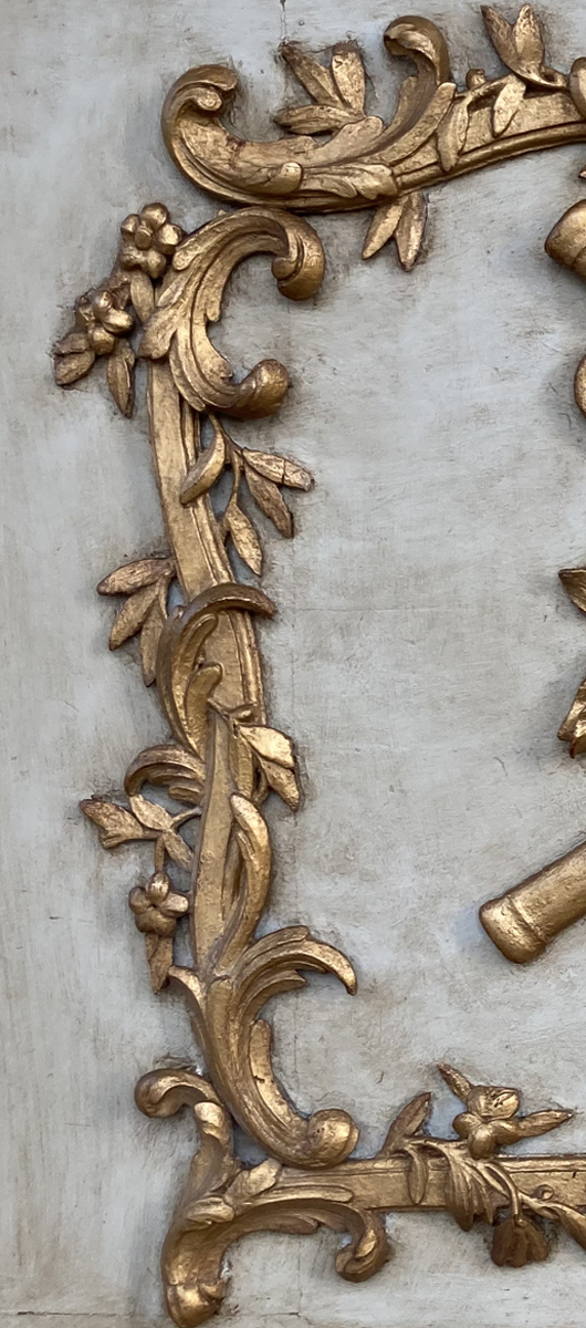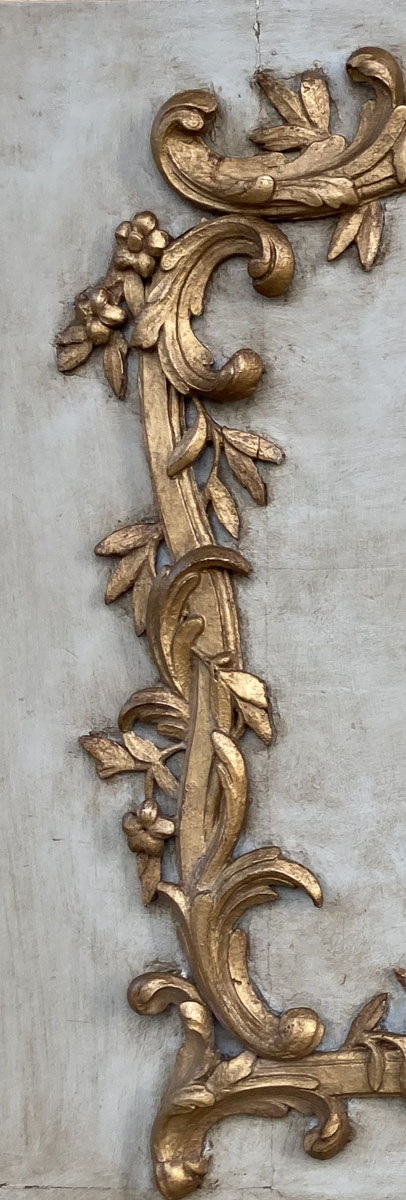 La scène est encadrée d’une élégante bordure végétale sculptée en léger relief, rythmée par des enroulements d’acanthe et de grappes de fruits, typiques du goût rocaille qui prédominait sous Louis XV.