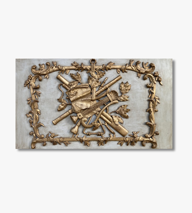 Élégant panneau en chêne sculpté, peint et doré, probablement destiné à orner un haut de porte.