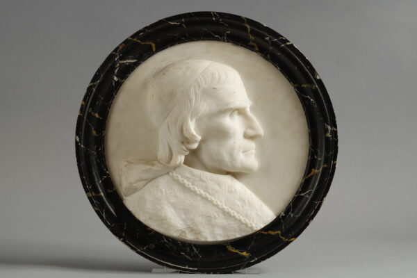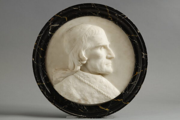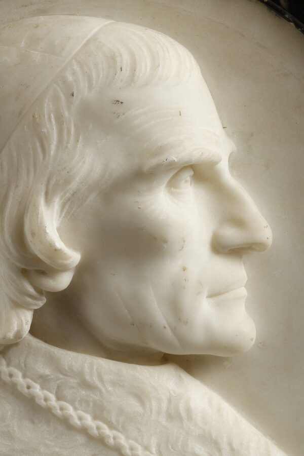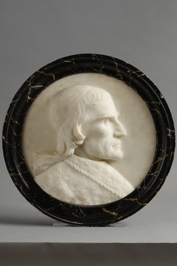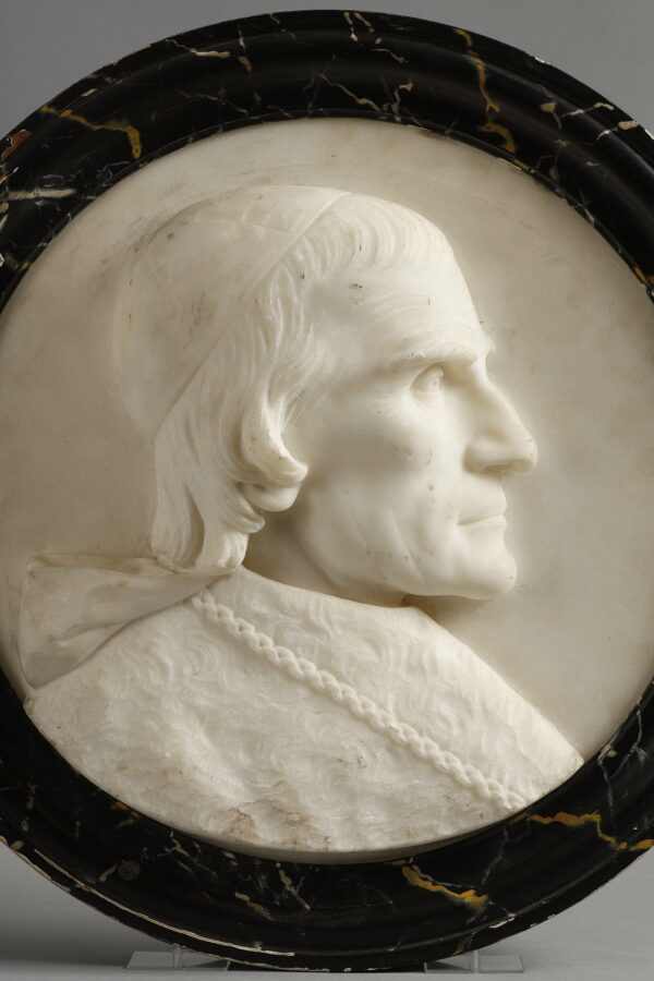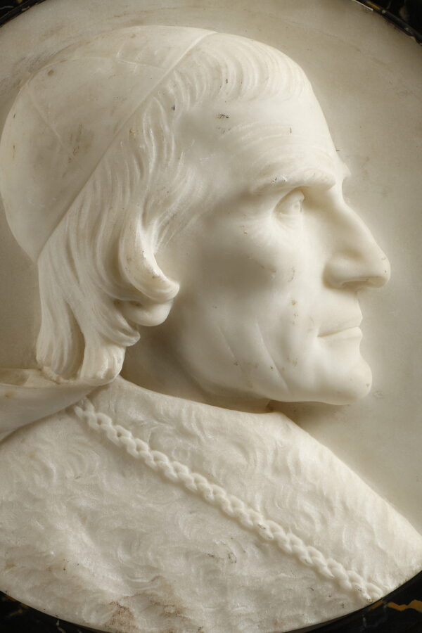 Grand Tondo en marbre de carrare à profil droit d’un pape du XVIIIe siècle.