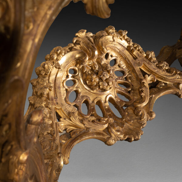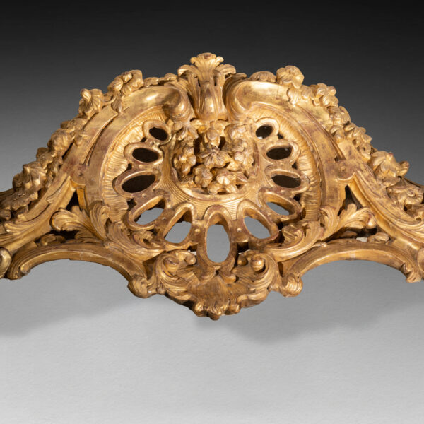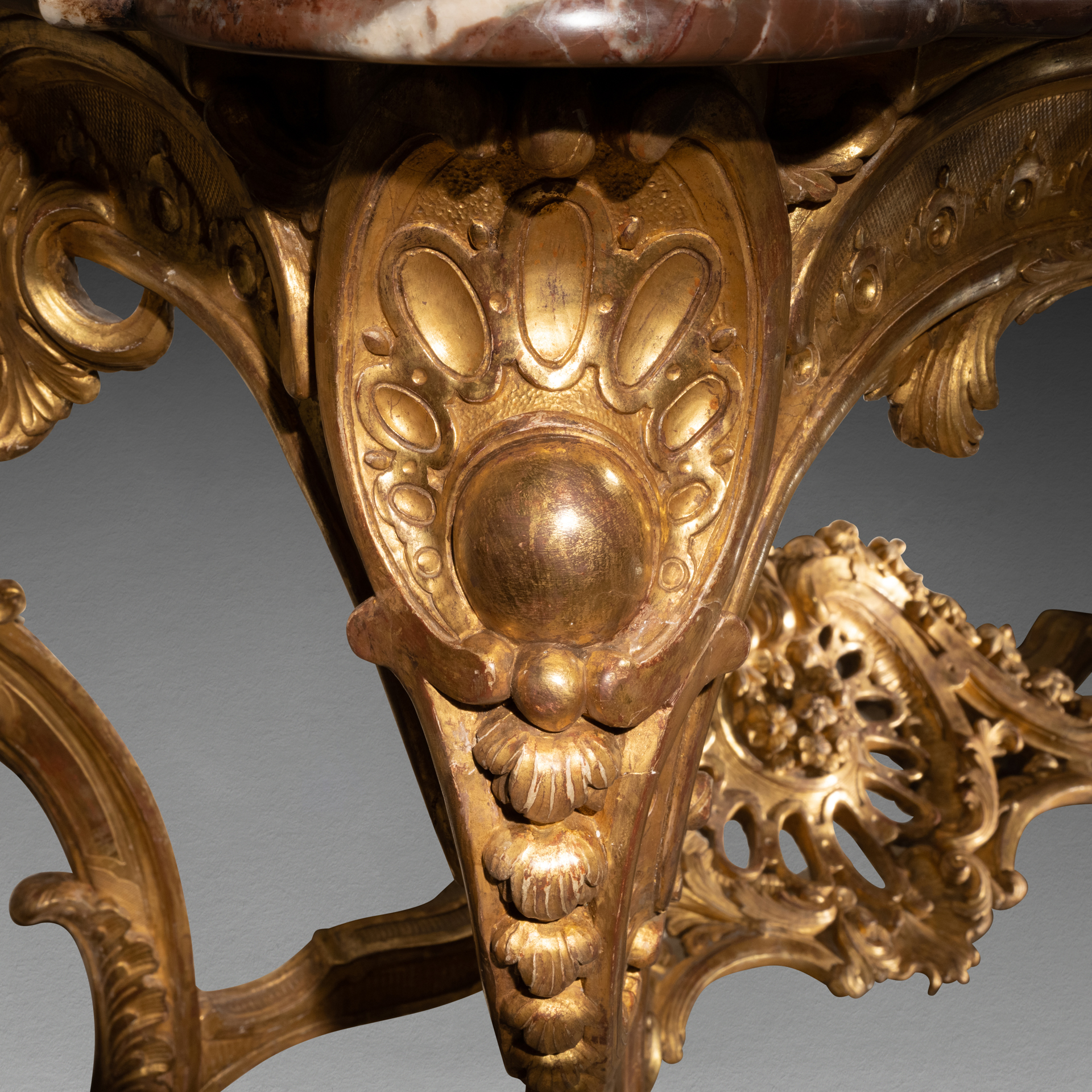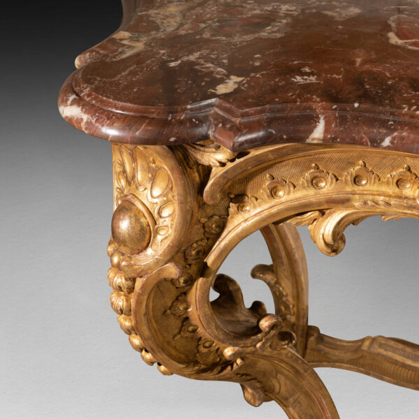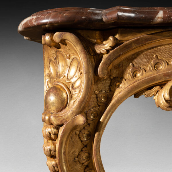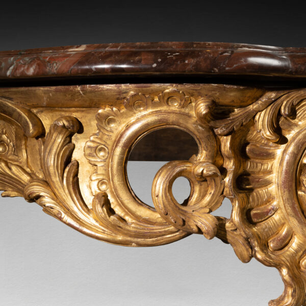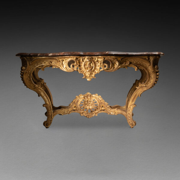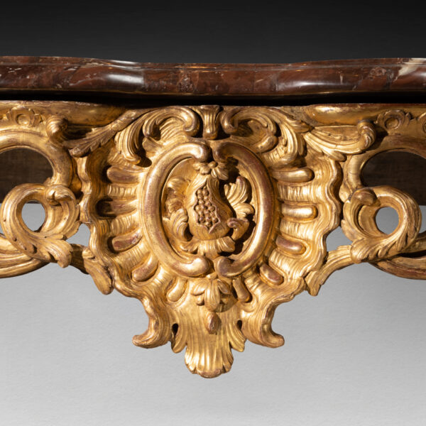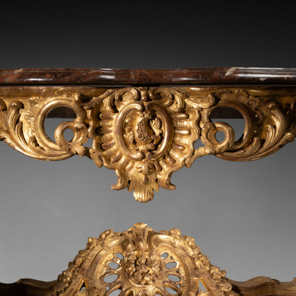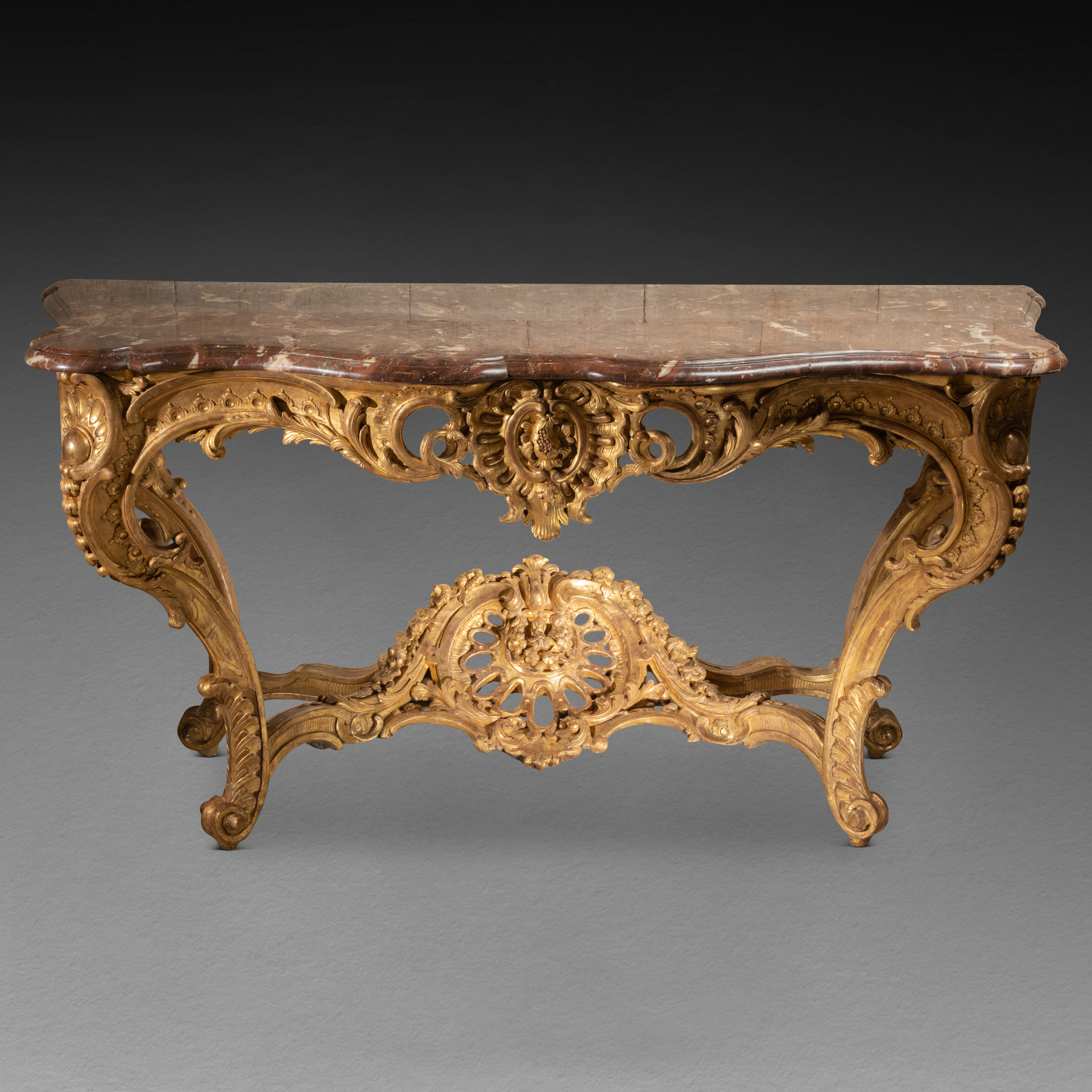Une grande console, de forme mouvementée, à quatre pieds, en chêne sculpté et doré, découvrant une traverse frontale sculptée de rinceaux et motifs floraux ; au centre une grenade dite « éclatée ». Les quatre pieds sont reliés par une entretoise formée d’un large motif de rocaille et rinceaux. La console est coiffée d’un marbre rouge dit « Rouge Royal ». Travail parisien époque Louis XV première moitié du XVIII ème siècle.