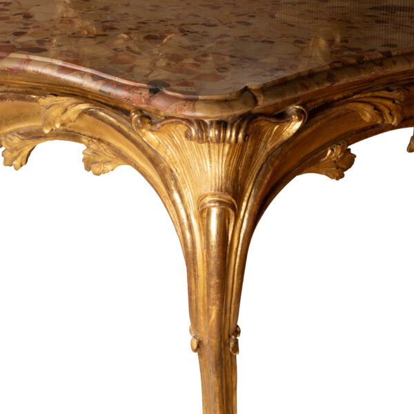 Grande console en chêne sculpté et doré , de forme mouvementée caractéristique du style symétrisé qui annonce le renouveau classique .ses quatre pieds à double cambrure s’ornent en leur haut d’une large coquille nervurée soutenant le marbre, de feuilles d’acanthe , le bas en enroulement .La traverse centrale ,en des lignes nerveuses, étirées et feuillagées ,est sculptée en son centre d’un important cartouche ajouré présentant un bouquet fleuri ; les cotés agrémentés de feuillages . Dessus en marbre d’Alep à bec de corbin en parfait état .