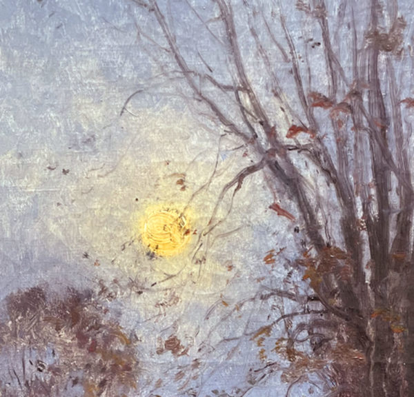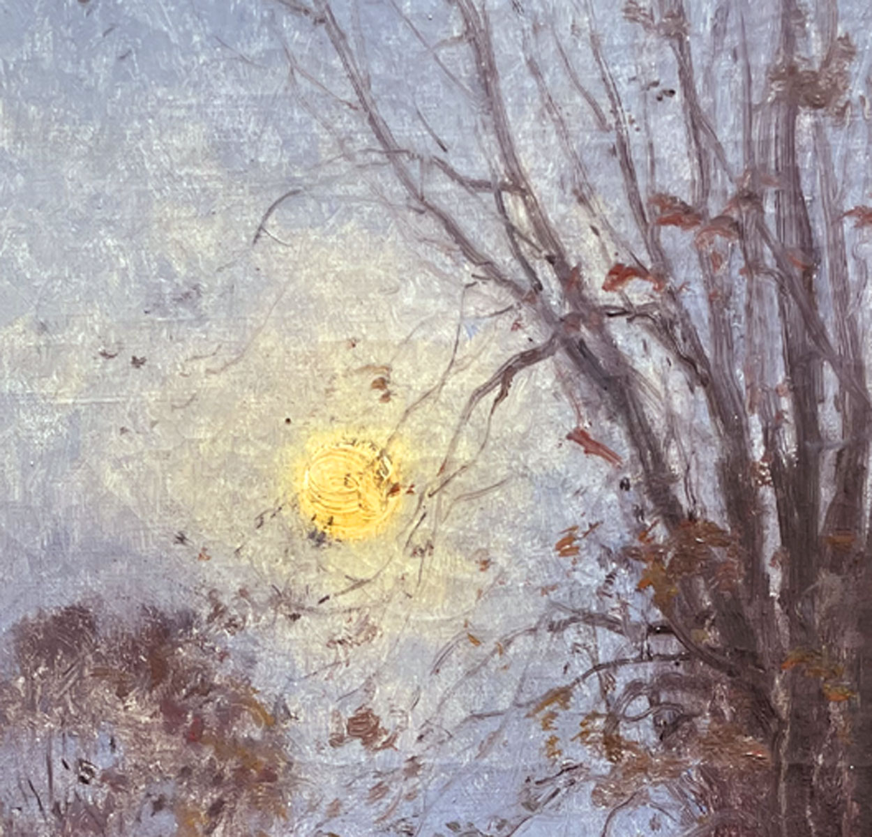Notre œuvre est construite dans des variations de violets, jaunes orangés et marrons.