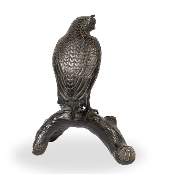 A bronze sculpture of an owl, consisting of two sections. The short-eared owl is perched on a tree branch with its head cocked to the right and its wings folded at its sides.
