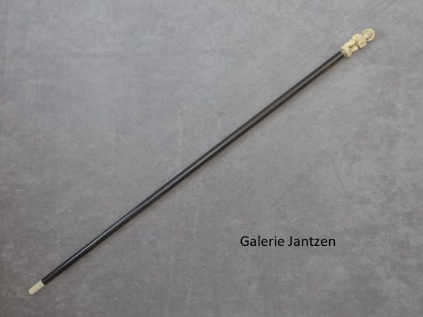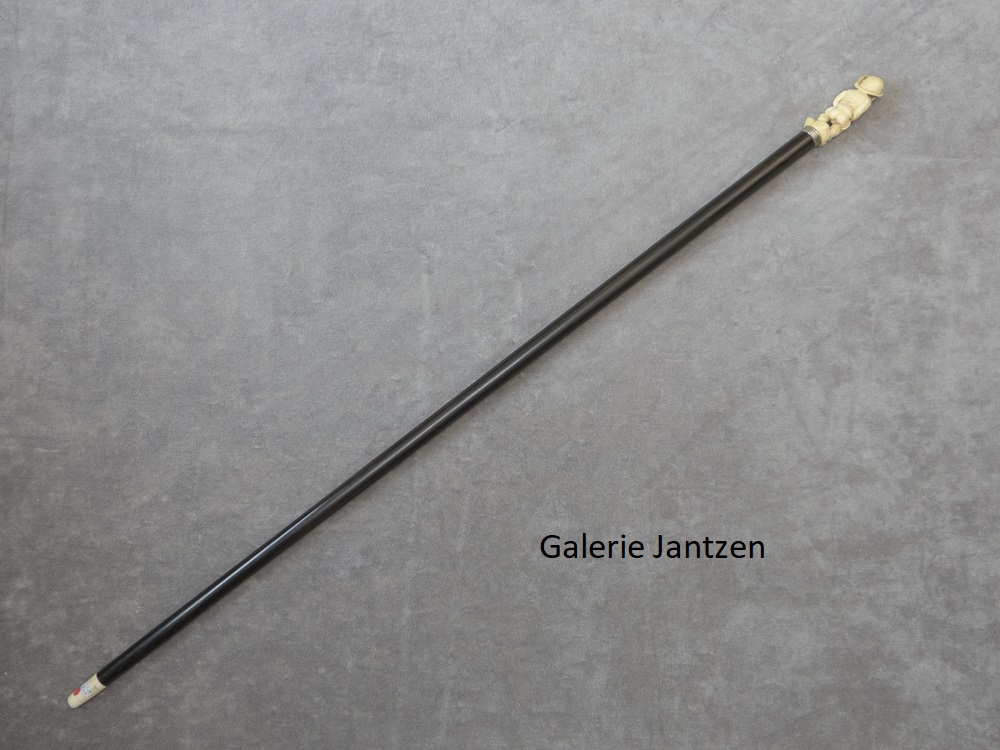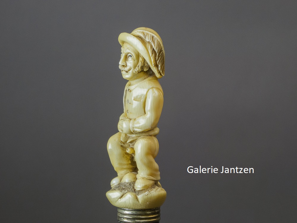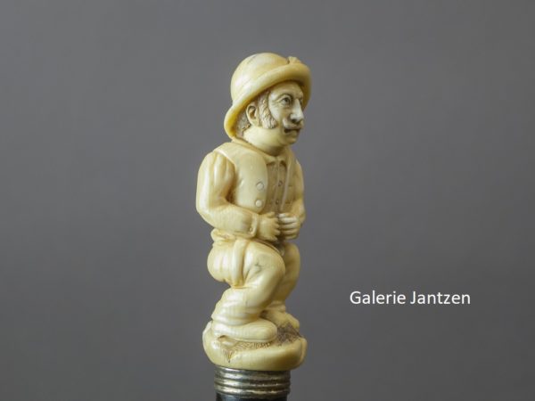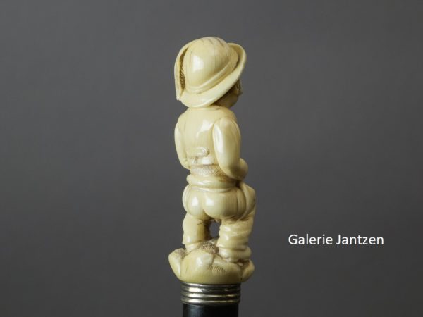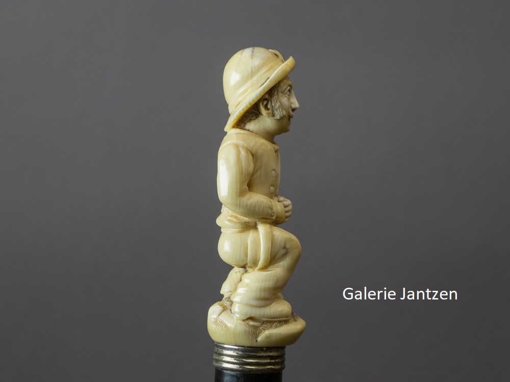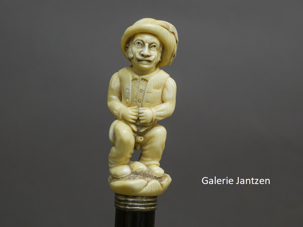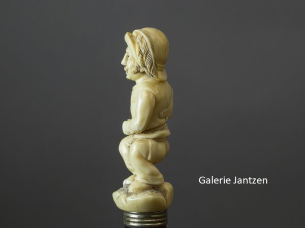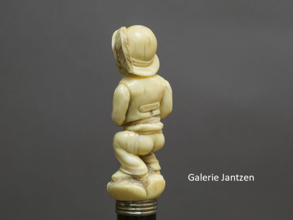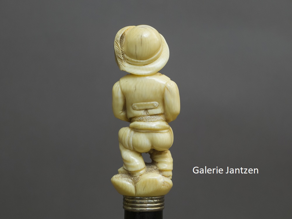 Très curieux pommeau humoristique en ivoire sculpté d’un homme portant un chapeau à plume, baissant son pantalon. Son sexe étant visible. Son visage semble souffrir, car il fait une grimace et lève les yeux au ciel.