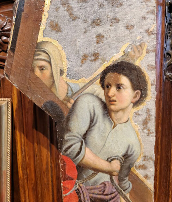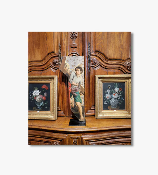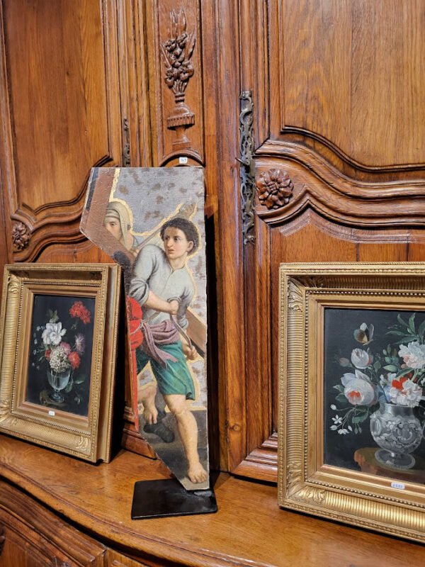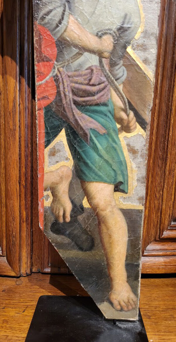 Ce fragment est une huile sur toile cotnrecollé sur métal, datant du 19ème, vraisemblablement issue d’un ensemble plus vaste, comme un retable ou un polyptyque.