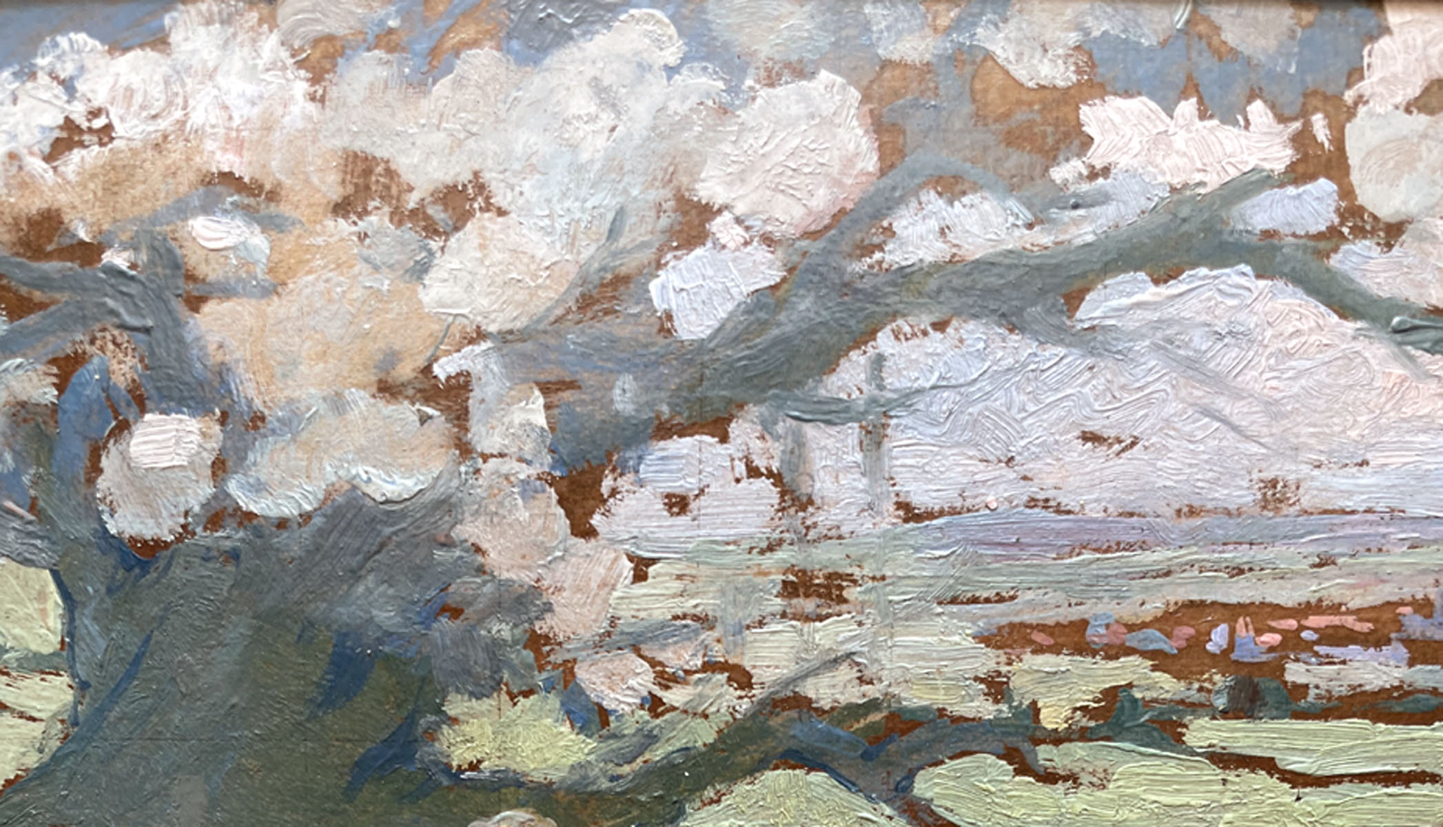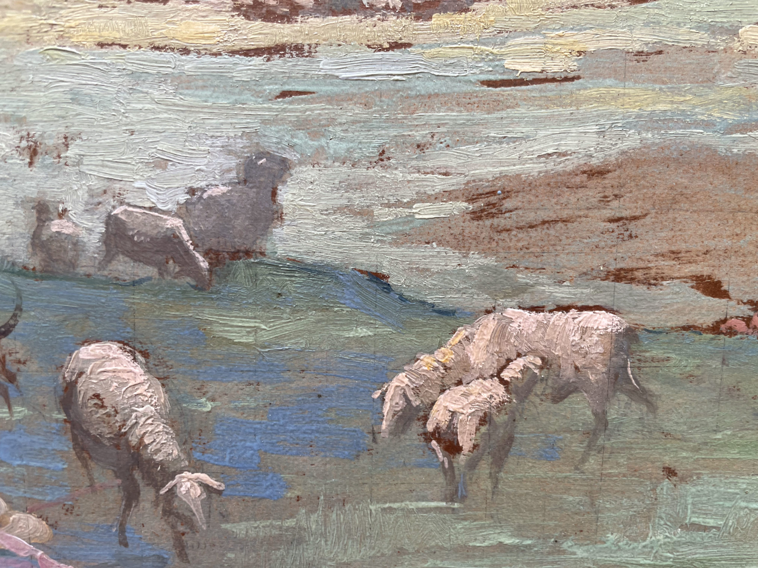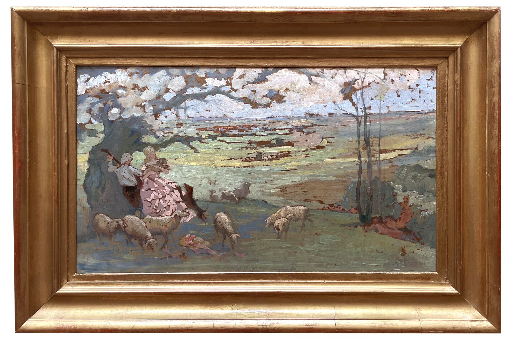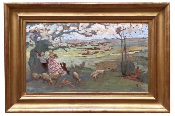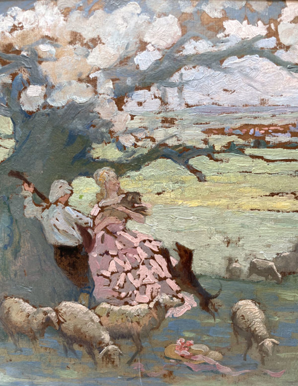 Ici, une bergère se laissant compter la sérénade par son amoureux. Une œuvre très fraîche et poétique avec de belles couleurs pastels.