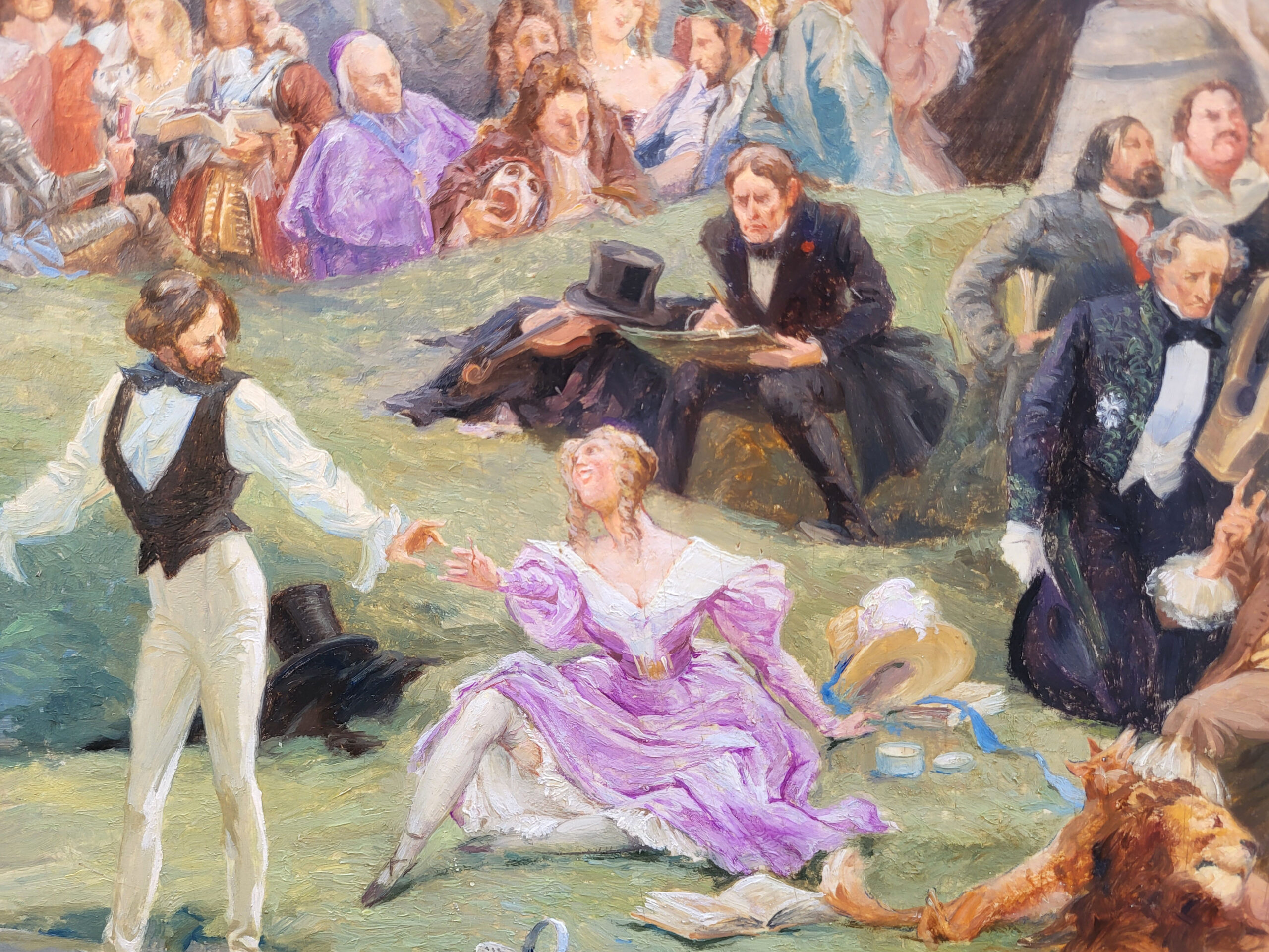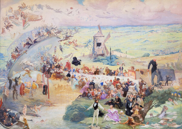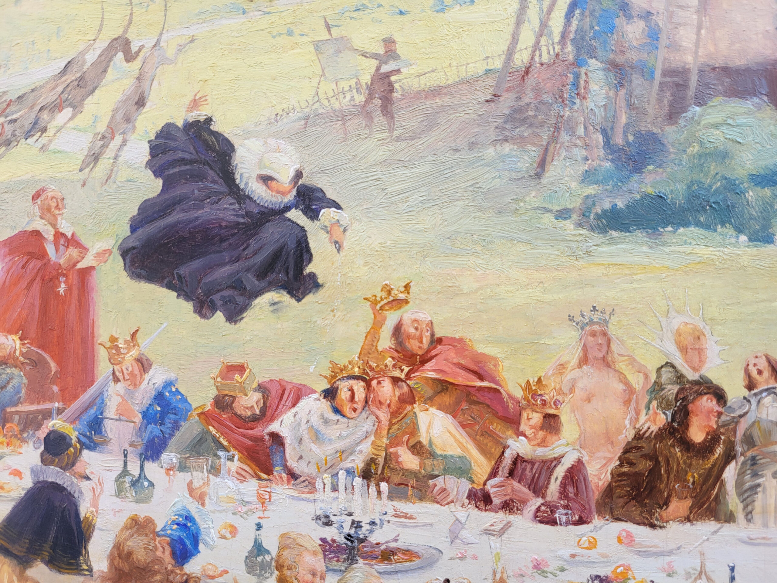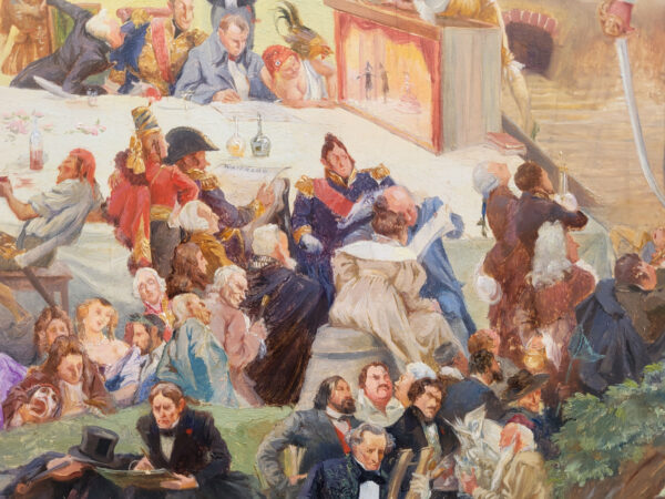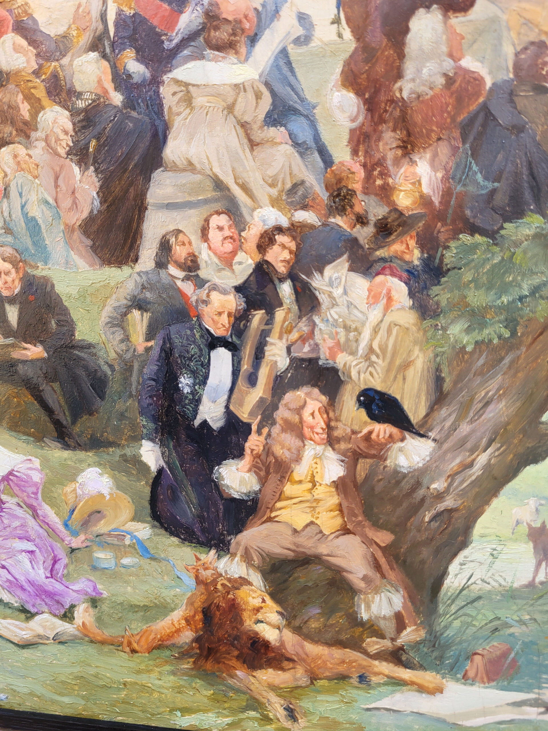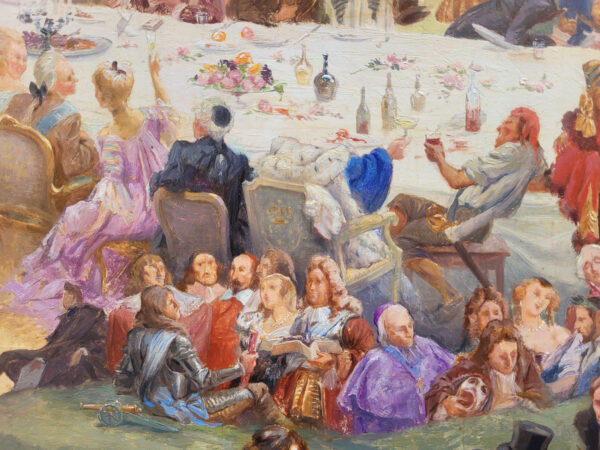 Au centre de la composition, une table est dressée, autour de laquelle festoient des figures emblématiques de l’histoire, de la littérature et de la philosophie enseignées à l’école. On y reconnaît Marie de Médicis, Jeanne d’Arc, Napoléon, Jean de La Fontaine, Molière et les philosophes des Lumières, entre autres.