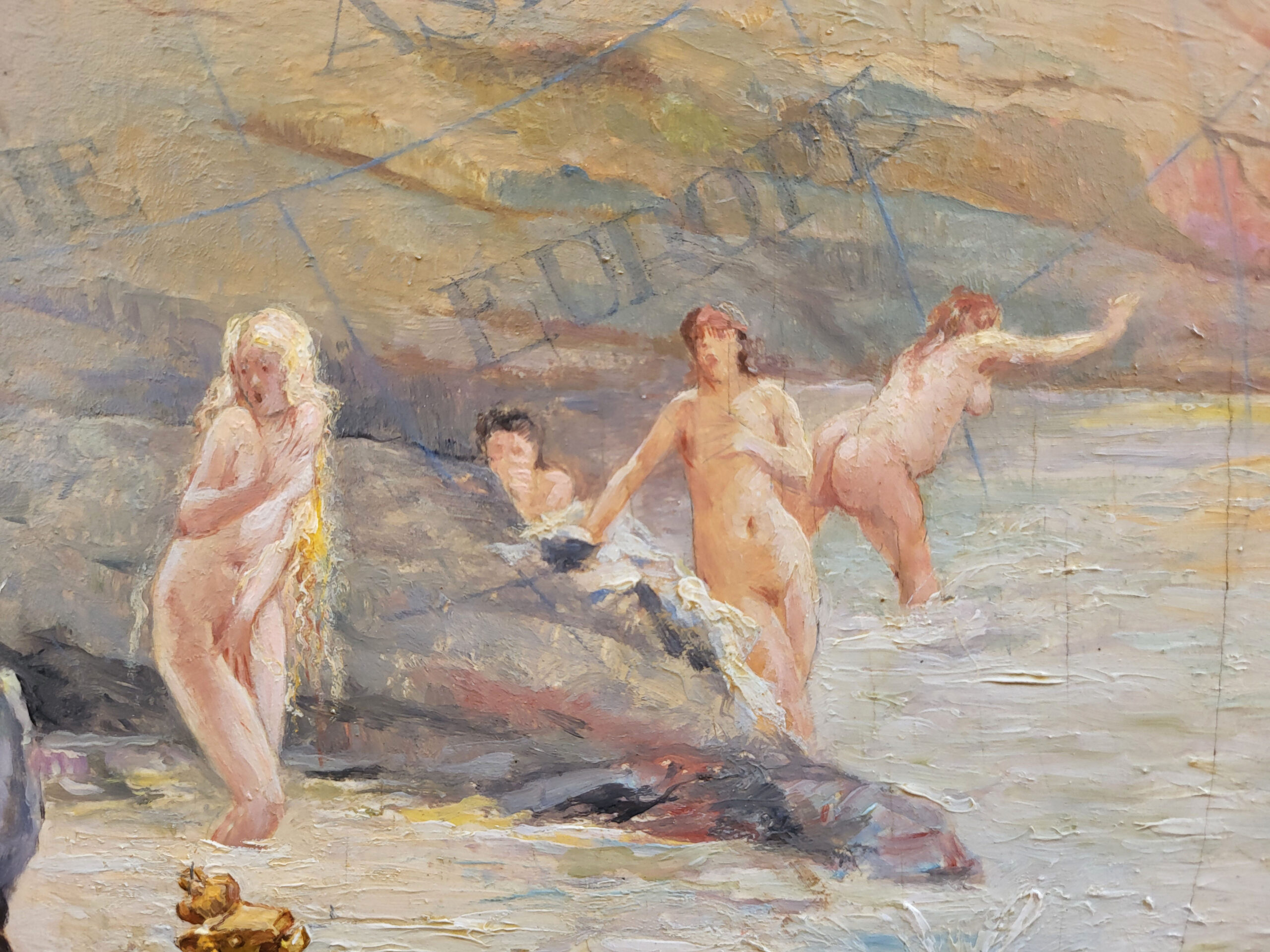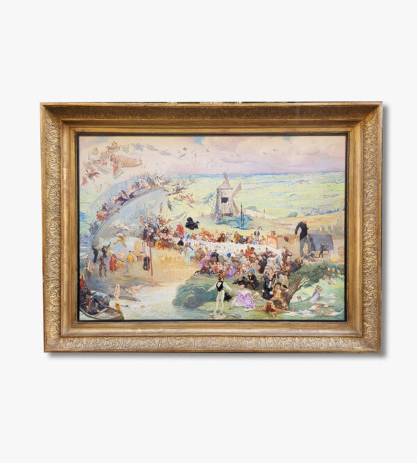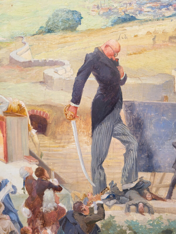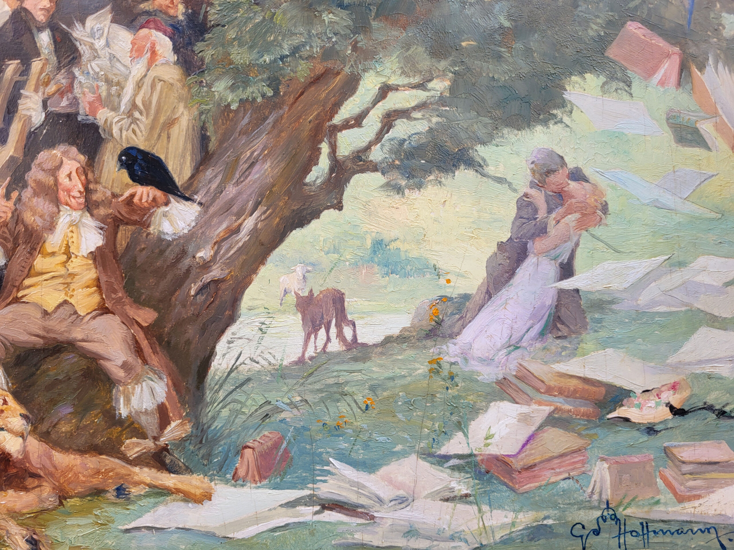 Au centre de la composition, une table est dressée, autour de laquelle festoient des figures emblématiques de l’histoire, de la littérature et de la philosophie enseignées à l’école. On y reconnaît Marie de Médicis, Jeanne d’Arc, Napoléon, Jean de La Fontaine, Molière et les philosophes des Lumières, entre autres.