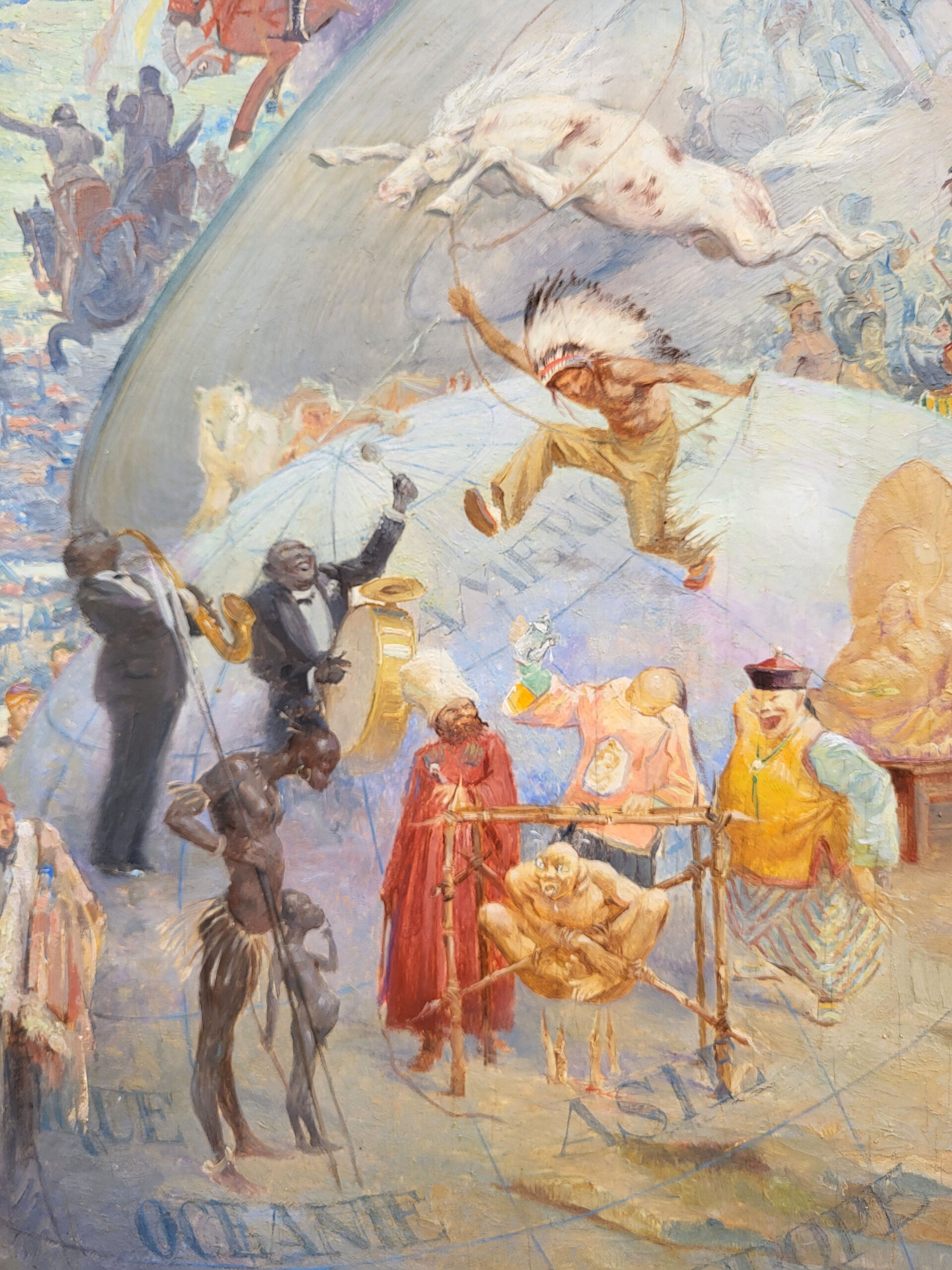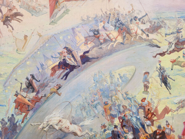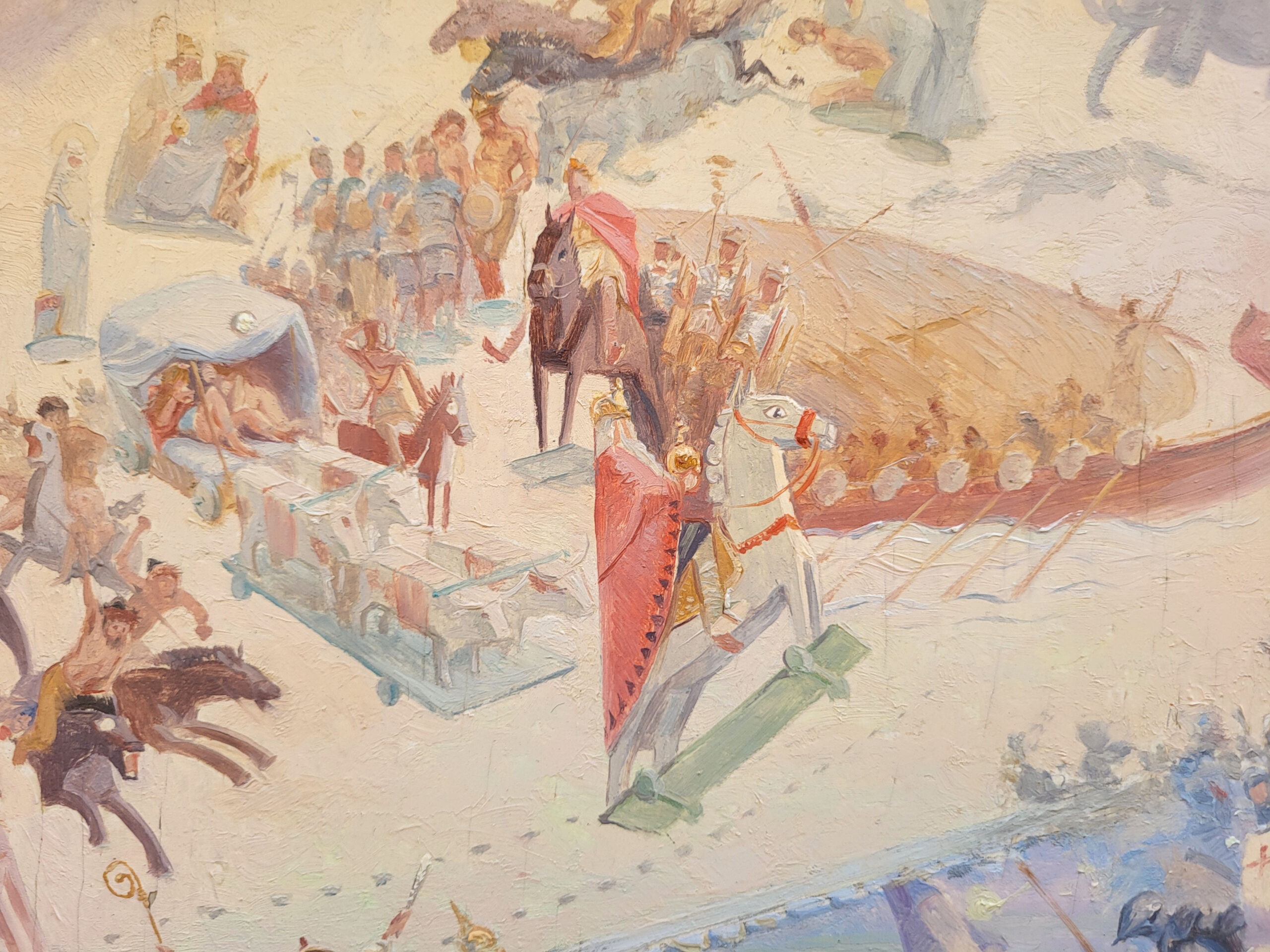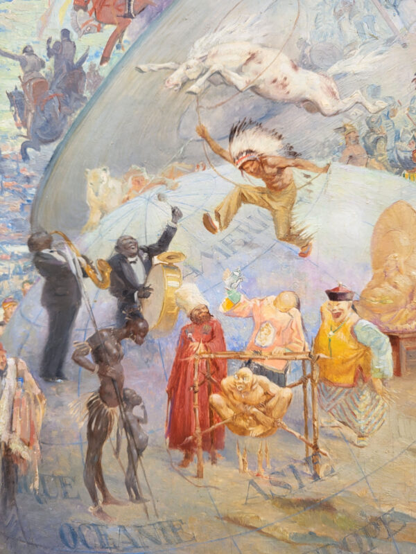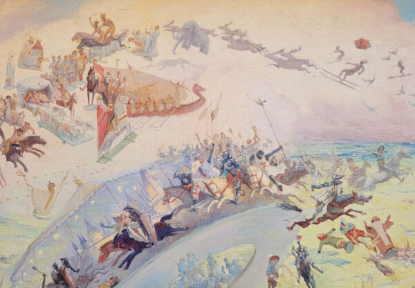 Dans la partie supérieure gauche, des chevauchées héroïques et épiques sont mises en scène, tandis qu’en dessous, une mappemonde évoque les grandes civilisations.