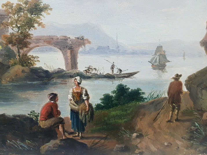 Ravissante huile sur panneau, représentant la vie près d’un port. Au fond un château et le port.