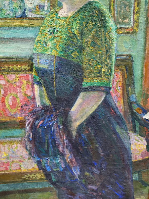 À Bonnard et Vuillard avec cet intérieur, aux couleurs vives, aux formes ondulantes, avec un plan serré intimiste.