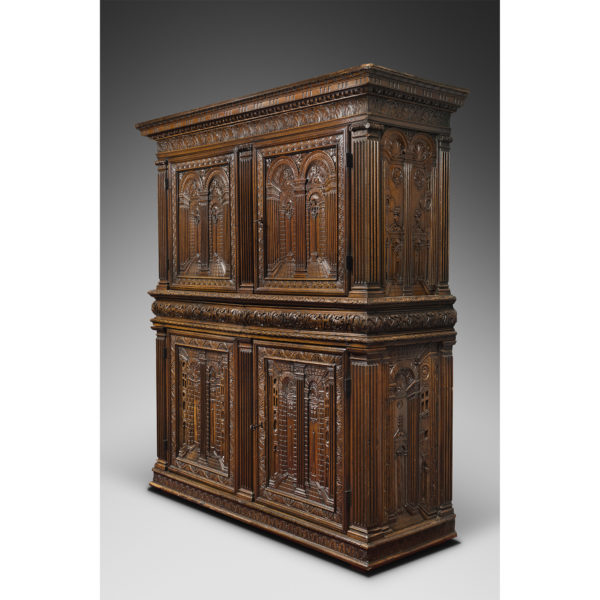 This Renaissance cabinet with an architectural decor appearing as much in the structure faithful to Antique rules as in the ornaments of its panels demonstrate the artistry of the Lyon workshops from where it originates. Sculptors and cabinet-makers worked hand in hand to express and translate with a unique talent Ital ian architectural perspectives.