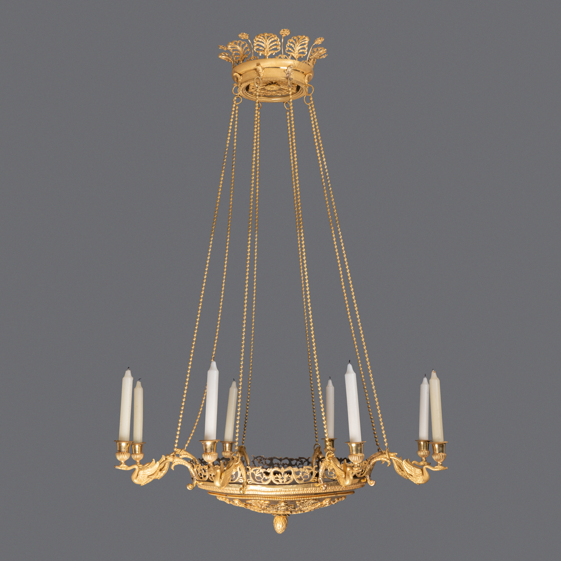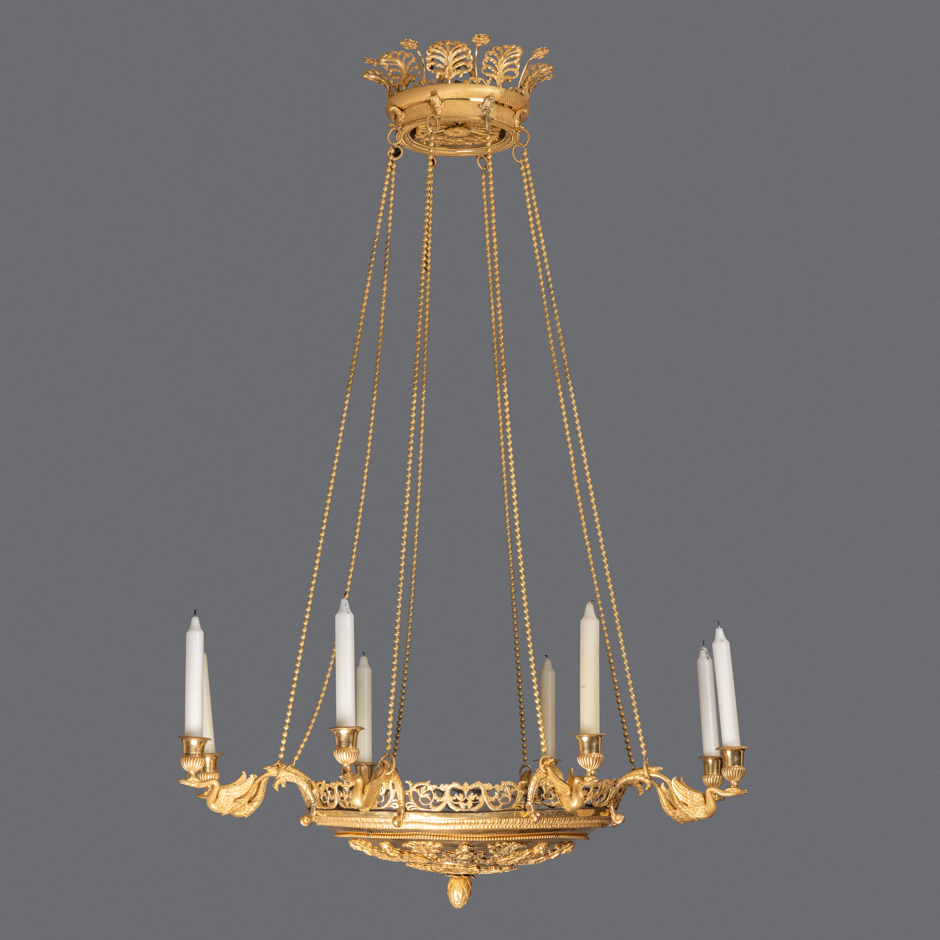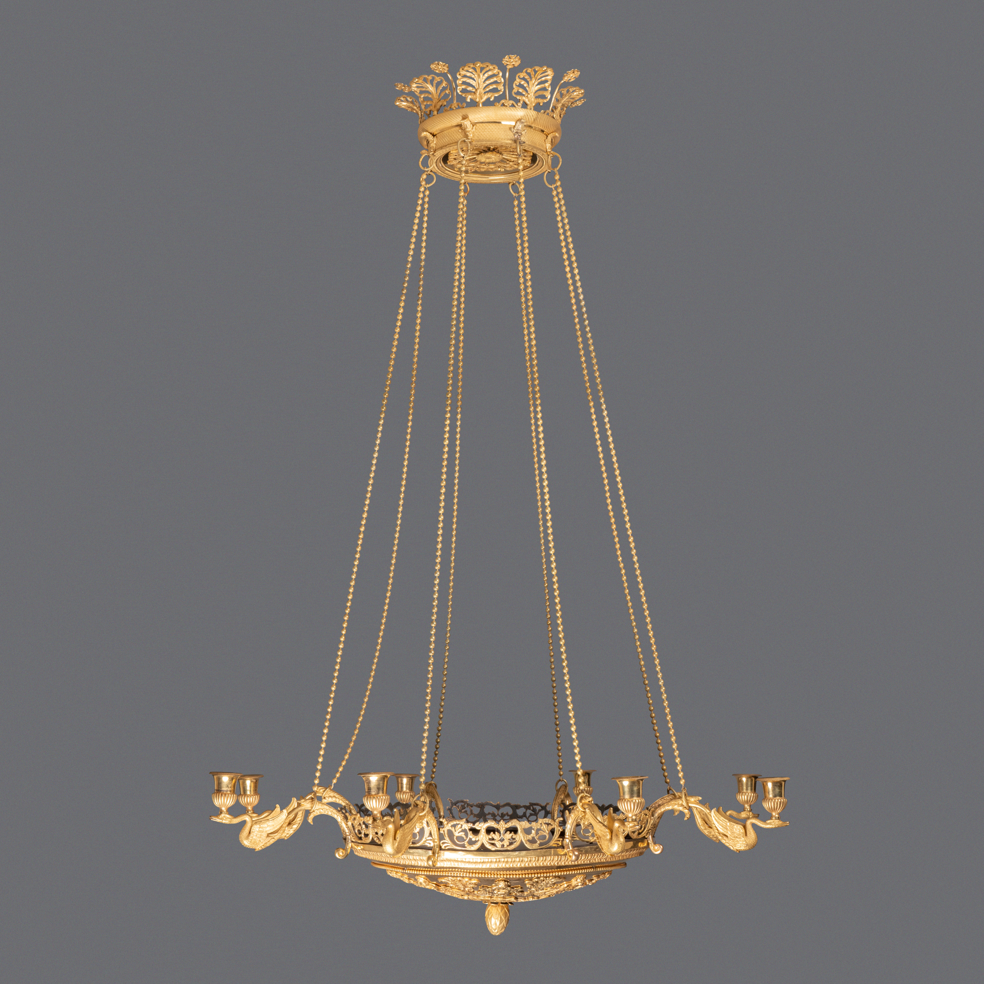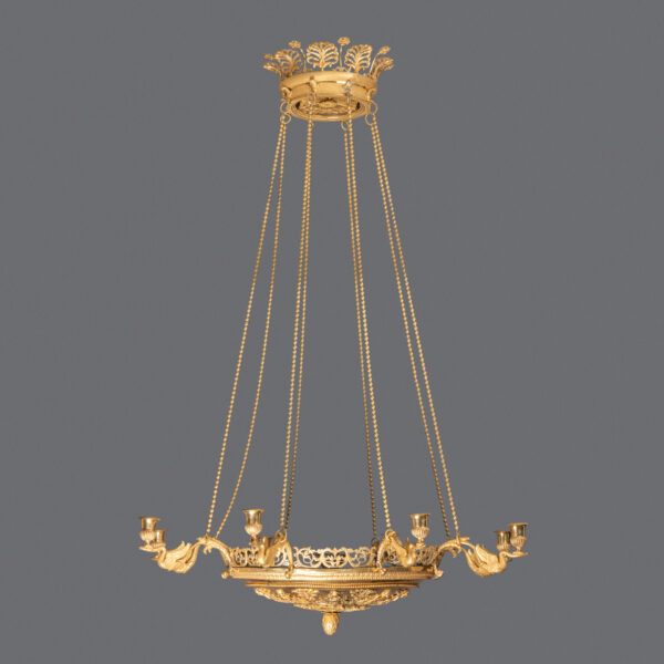 Un lustre en bronze ciselé et doré, la vasque décorée d’une frise de divinités des eaux encerclant une rosace de palmettes ornées de feuilles et fruits, est équipée de huit bras de lumières à décor de cygnes supportant les binets ; ceinture ajourée de frise de feuilles. Elle est reliée par huit chaînes perlées au pavillon supérieur décoré de palmettes et de fleurs.