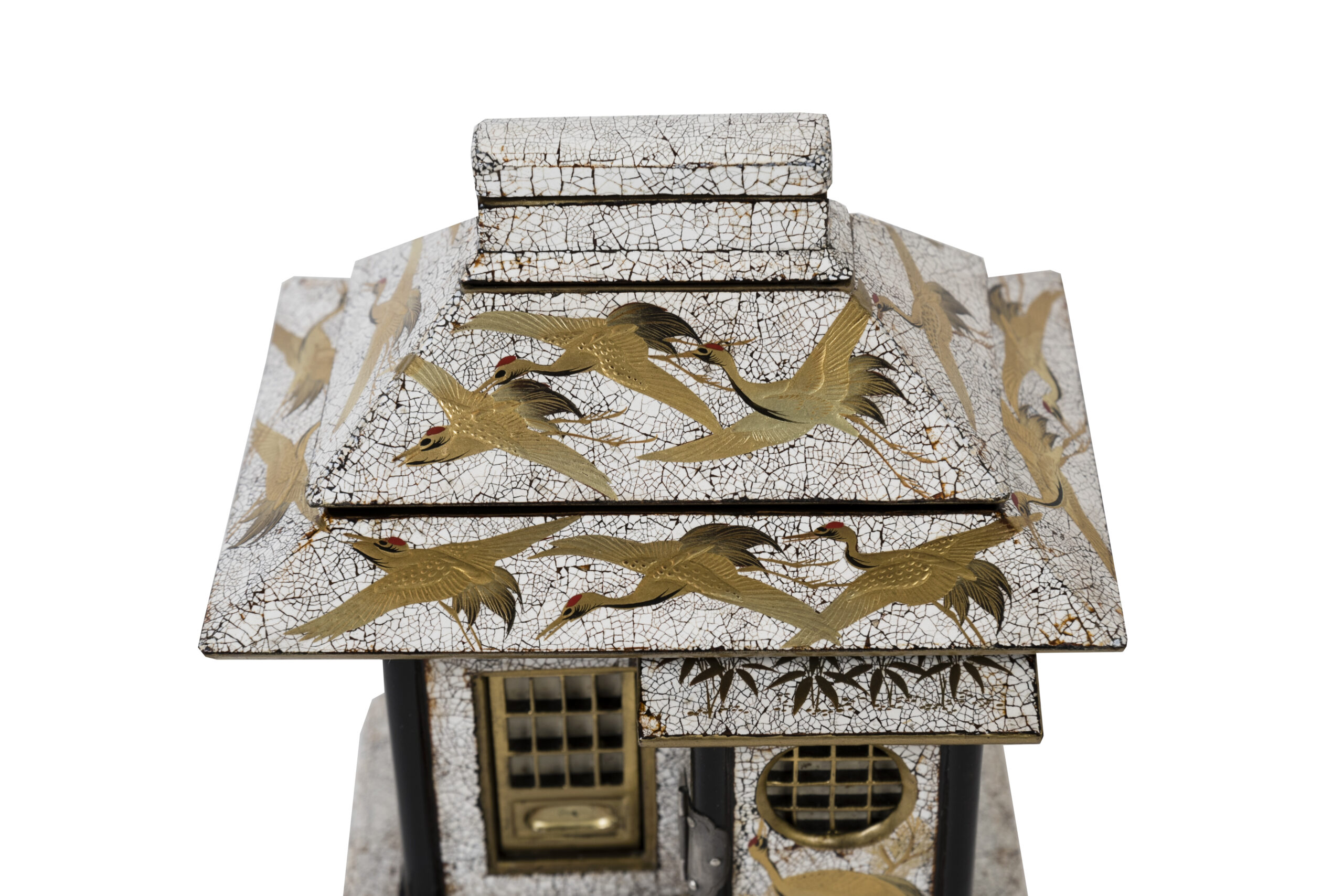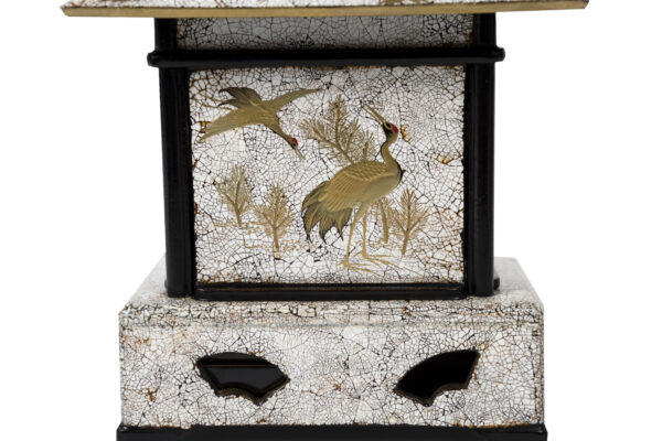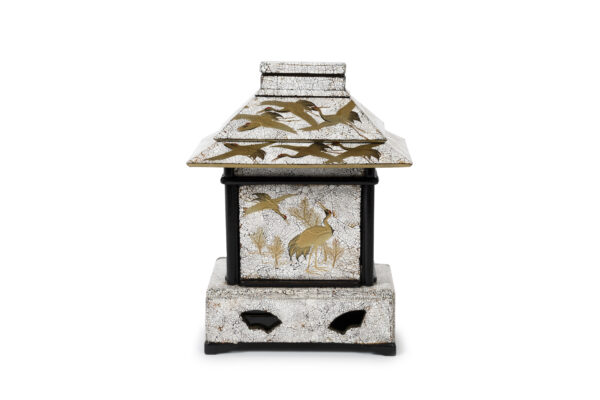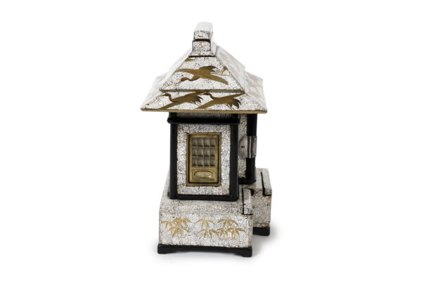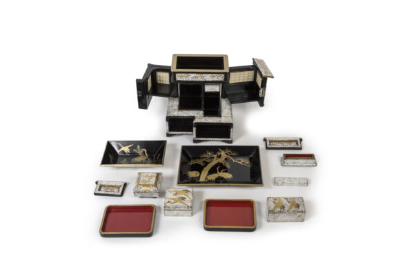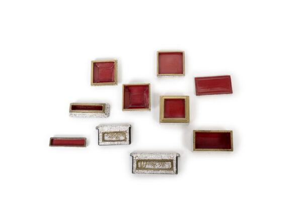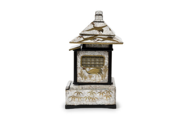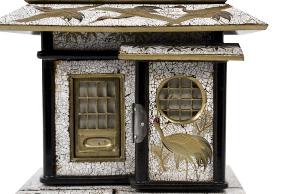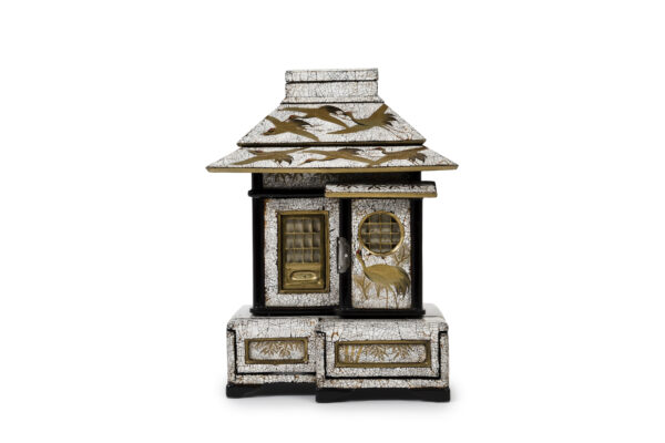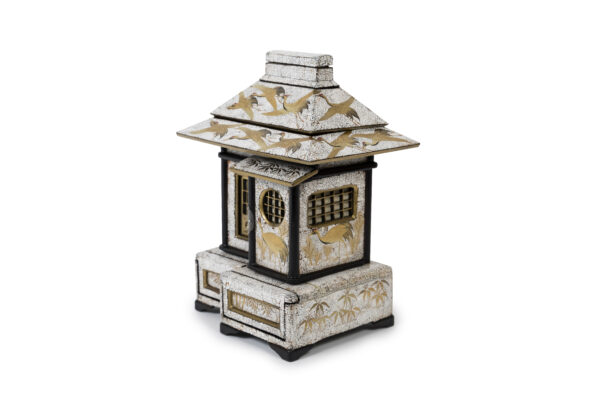 Elle est composée de plusieurs compartiments et plateaux au niveau du toit, des murs s’ouvrant au centre avec un fermoir en étain, et de la base.