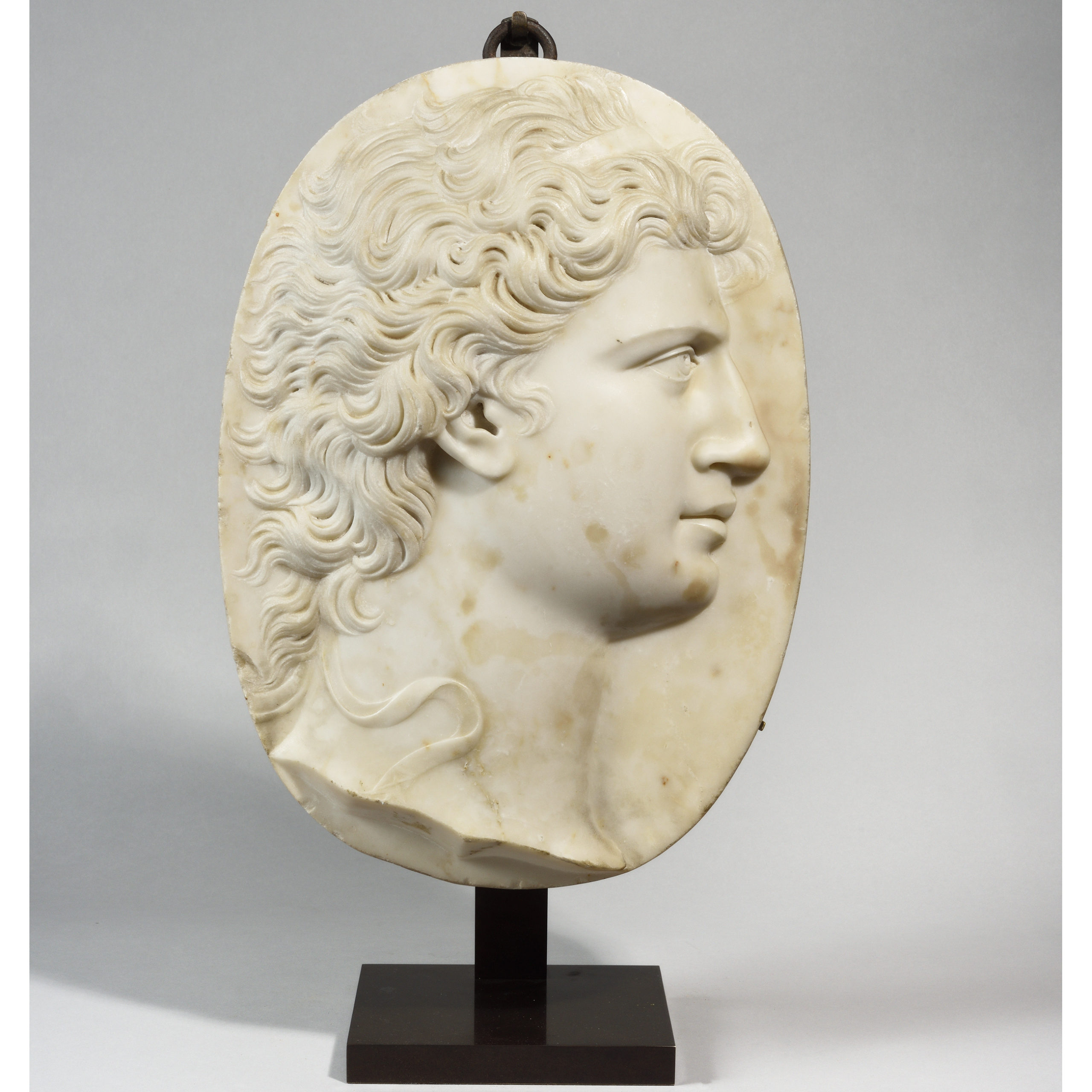 Our oval white marble medallion is a presumed portrait of Alexander the Great. This beautiful bas-relief is made according to the neo-classical canons of representation of the time. Particularly noteworthy is the antique treatment of curls in the hair.