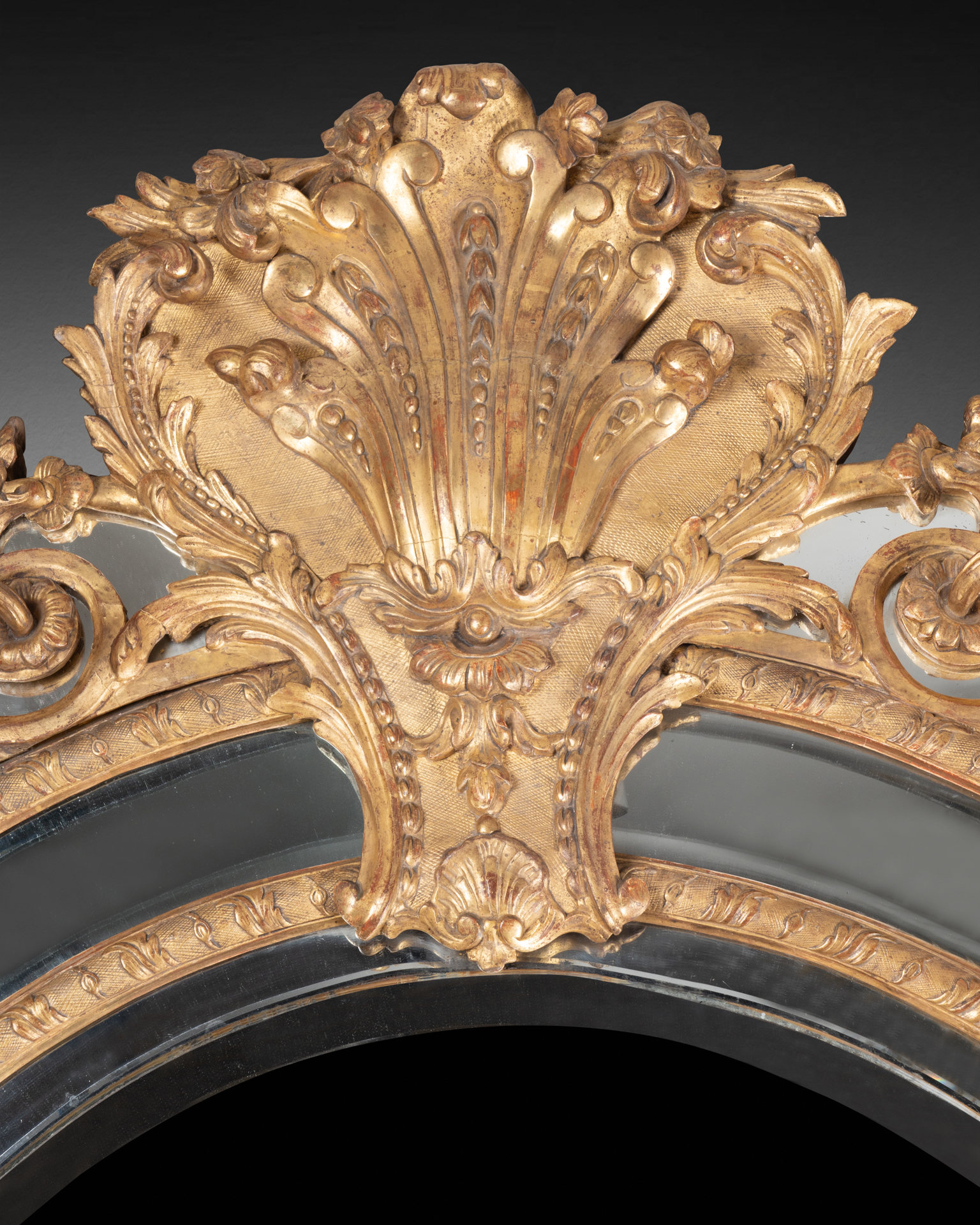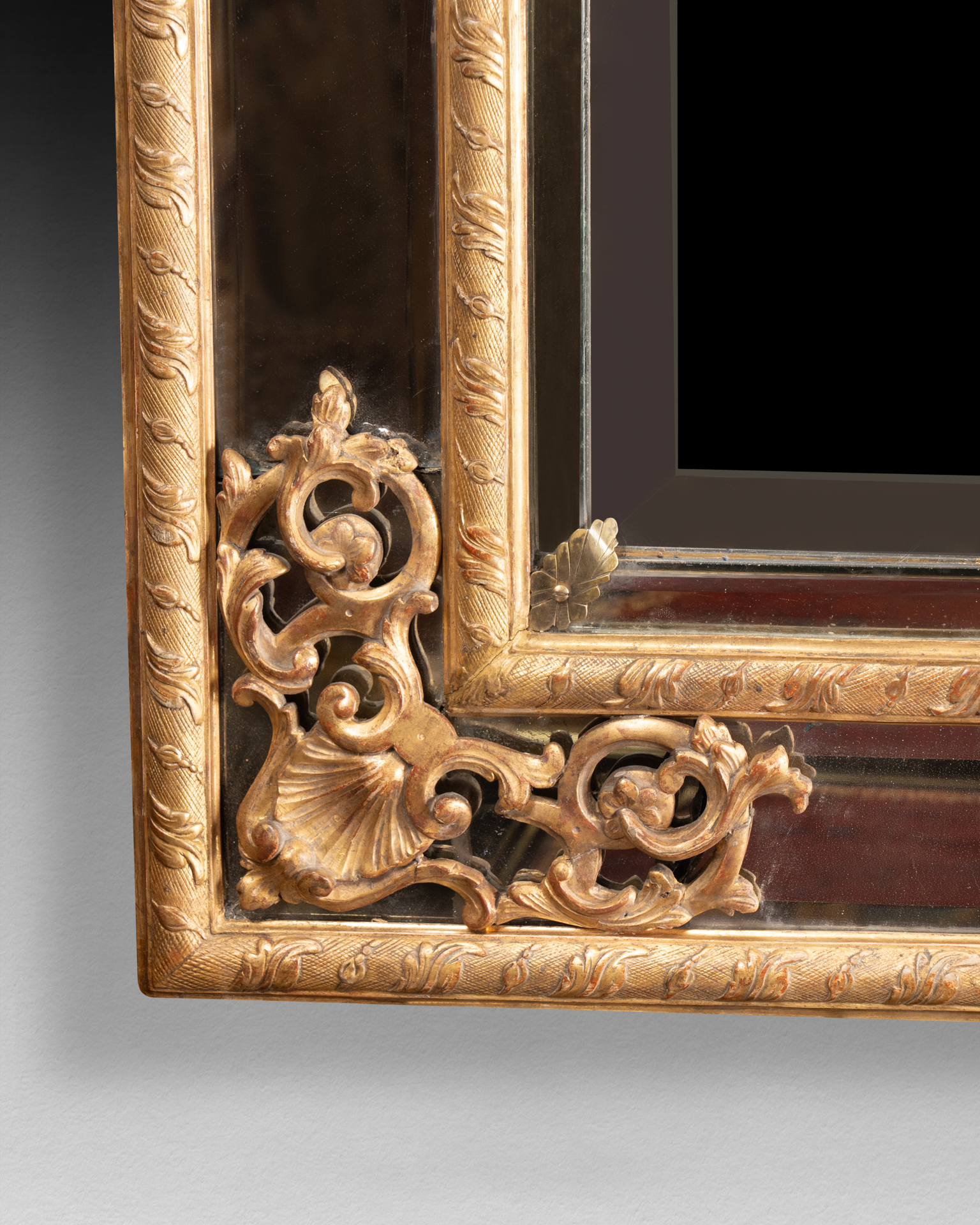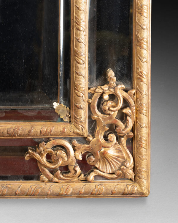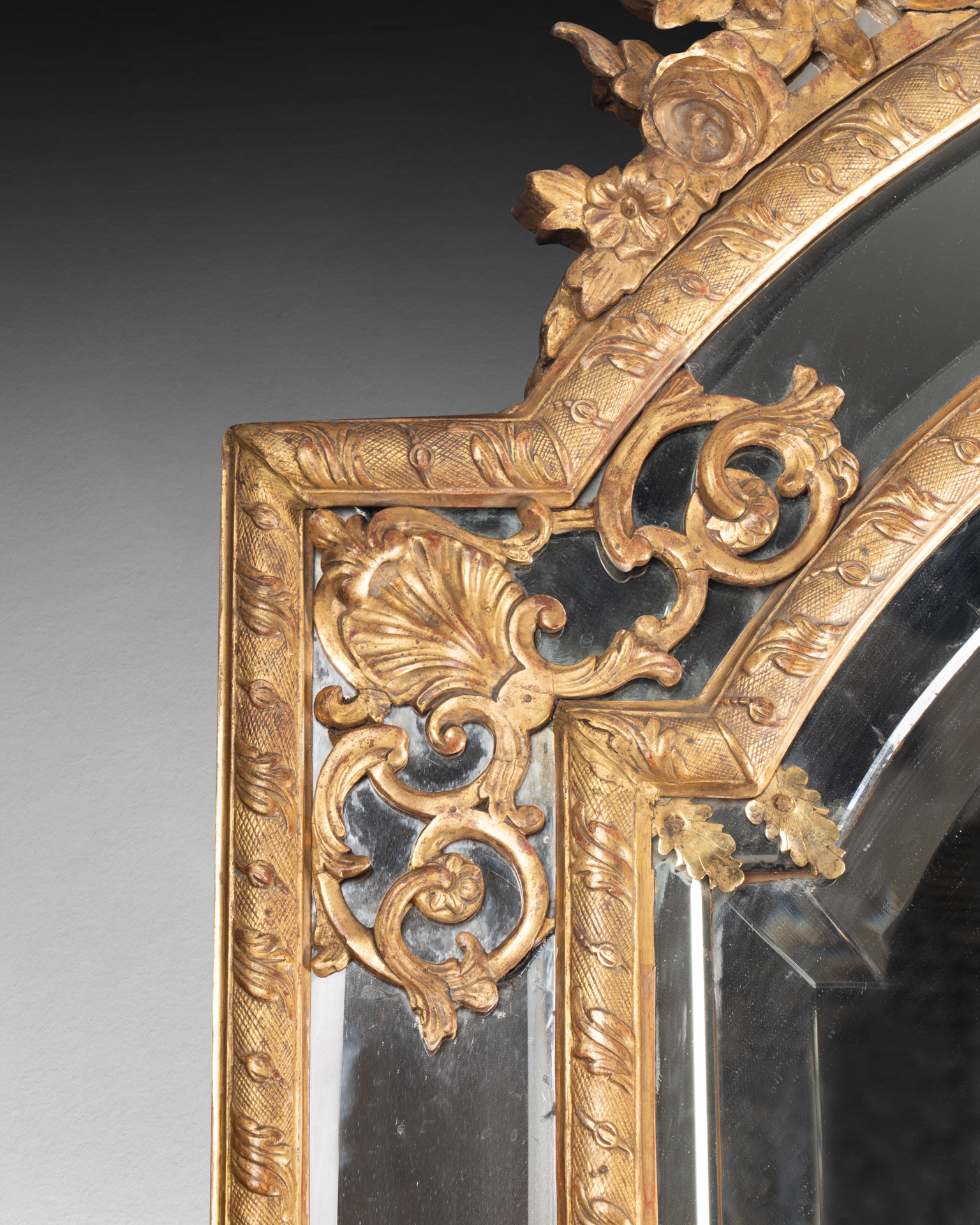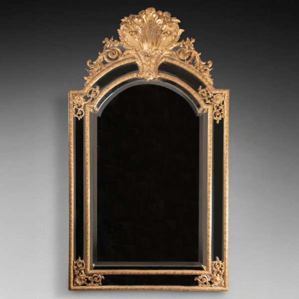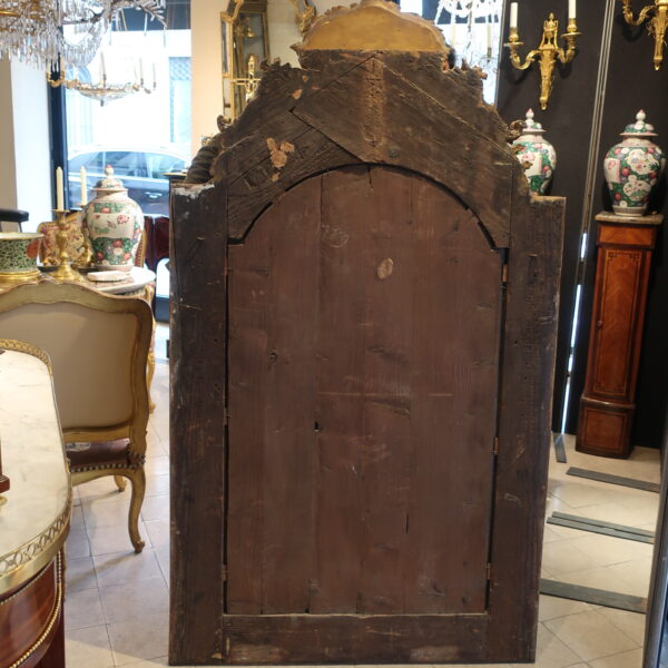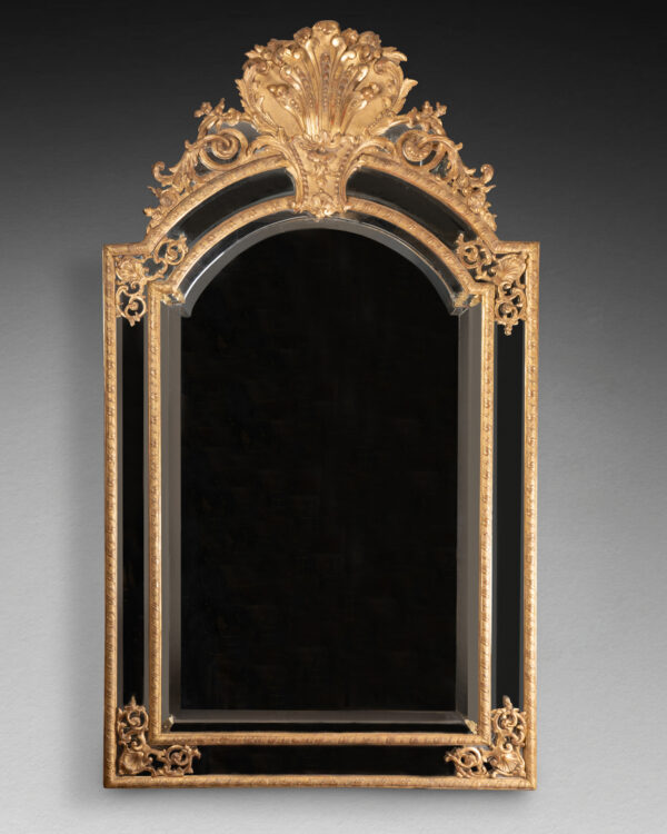 Miroir à pare closes de forme quadrangulaire, la partie haute cintrée recevant une très large coquille encadrée de rinceaux feuillagés. Elle se compose d’un double encadrement à la bérain, cernant des pare closes de miroir au mercure biseautées, décorées de cartouches d’angles en bois doré sculpté. Le miroir central au mercure, en parfait état, encadré de baguettes de miroir biseautées associées par des agrafes de laiton doré. Travail Français époque Régence. Miroir au mercure en parfait état.