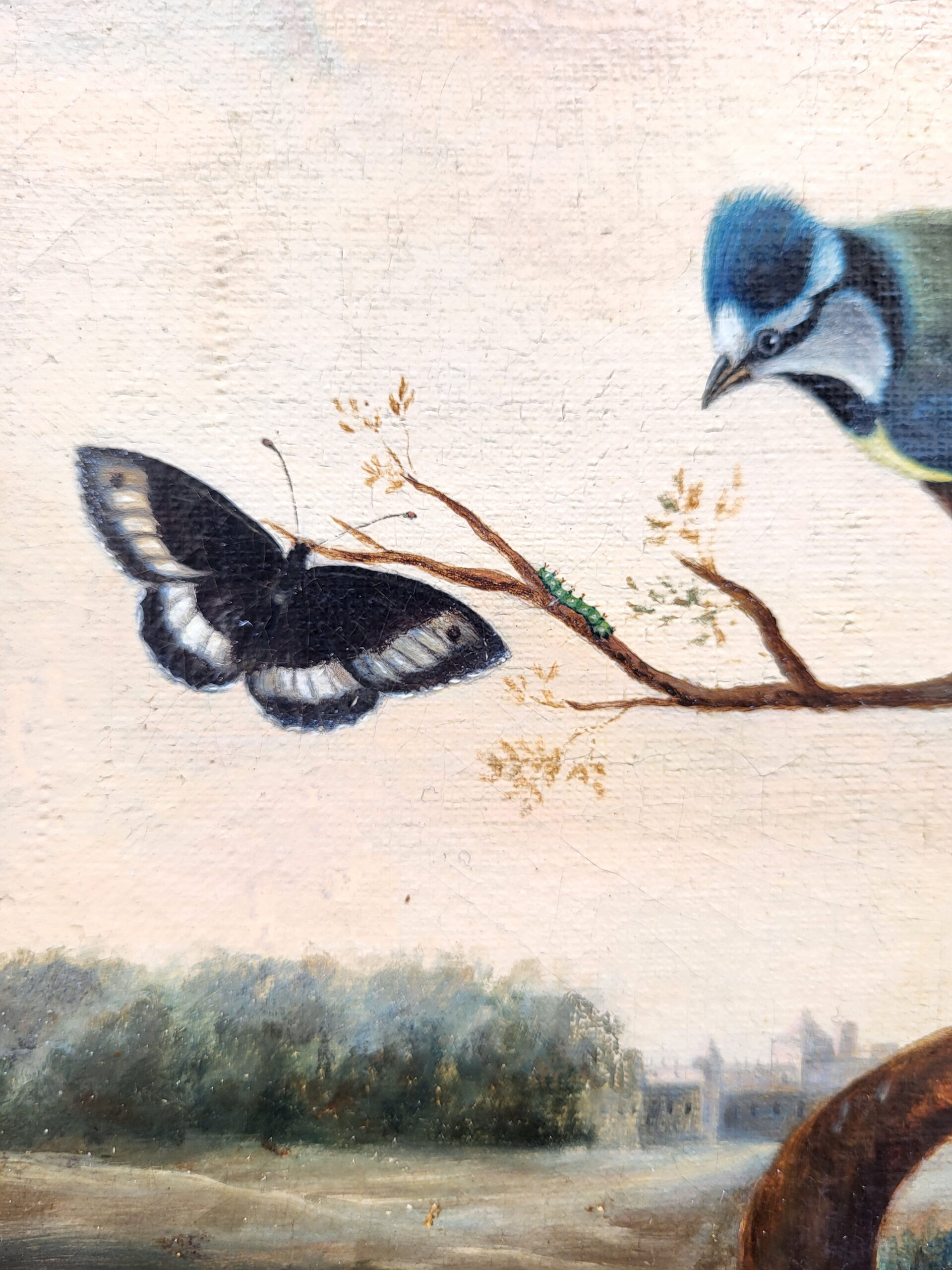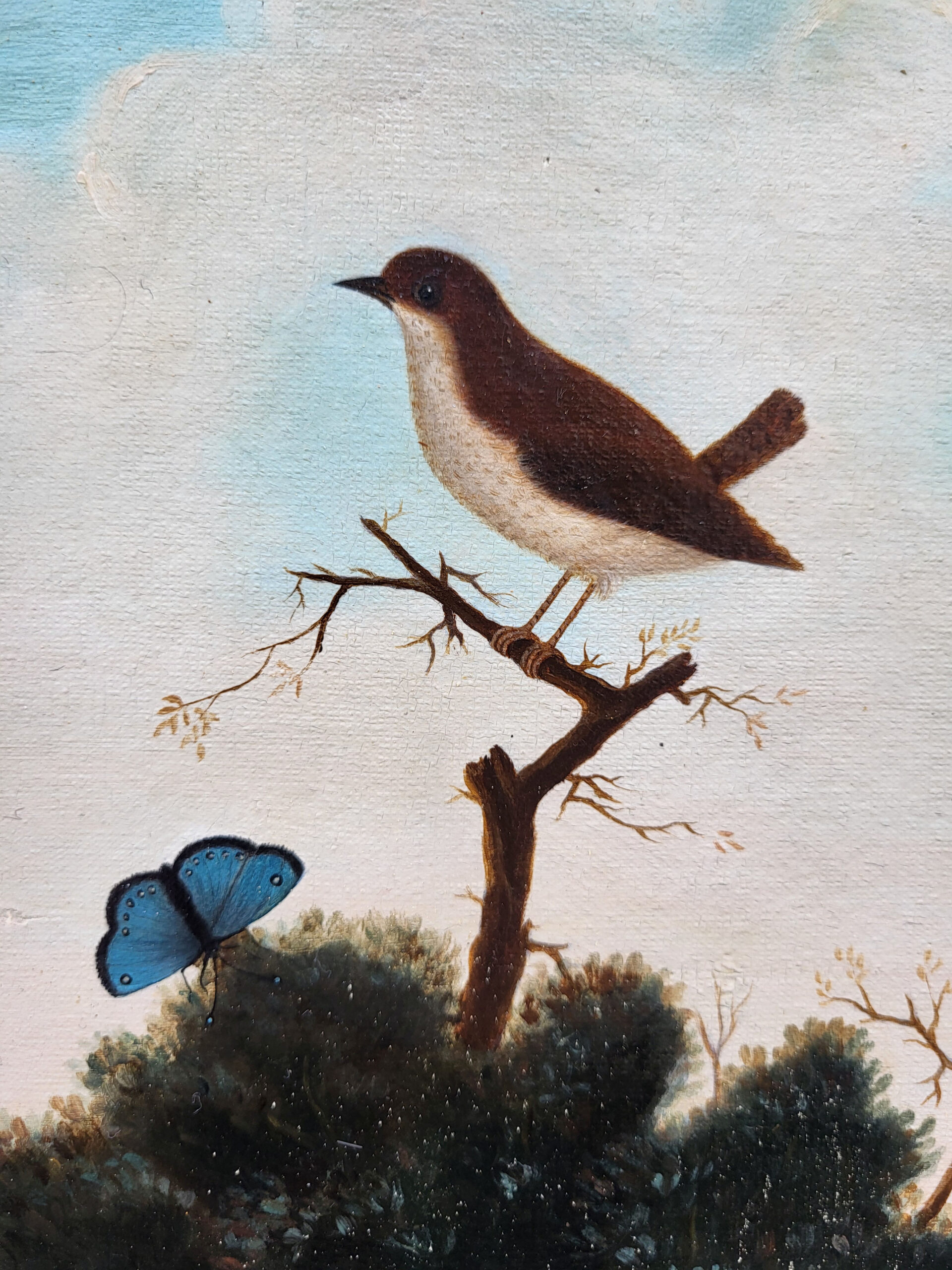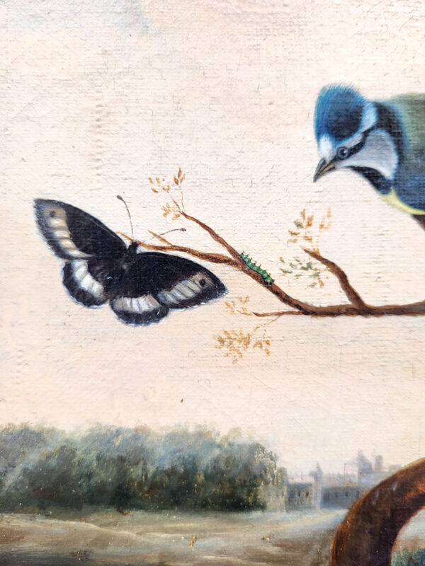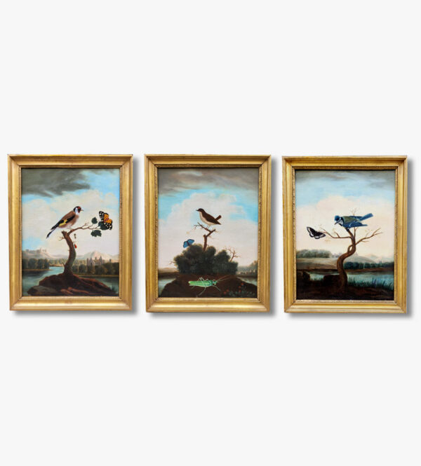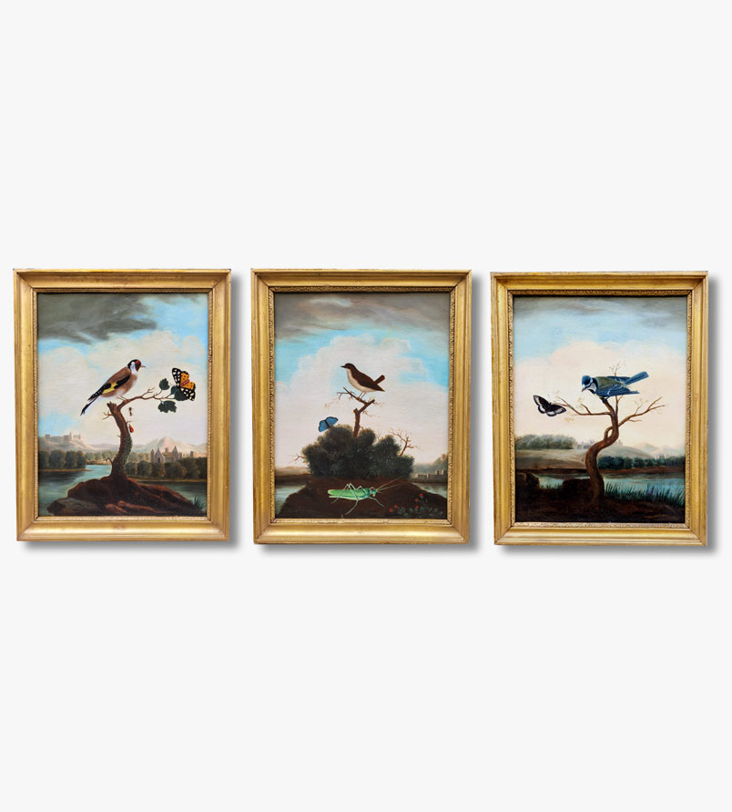 Trois très belle huiles repésentants divers oiseaux et insectes avec avec en arrière plan des paysages.