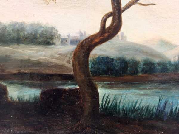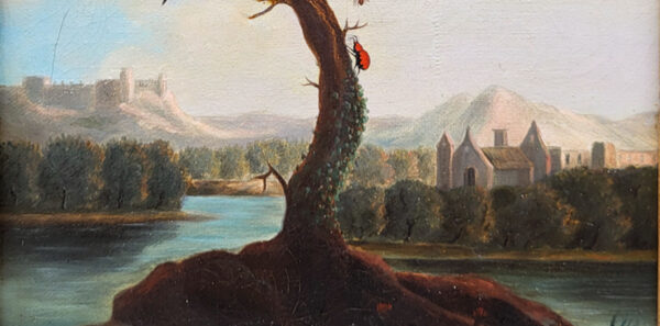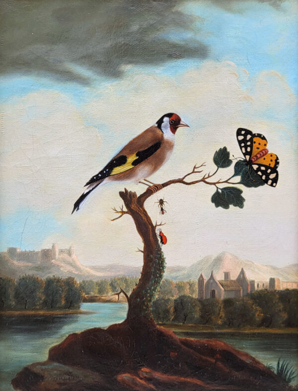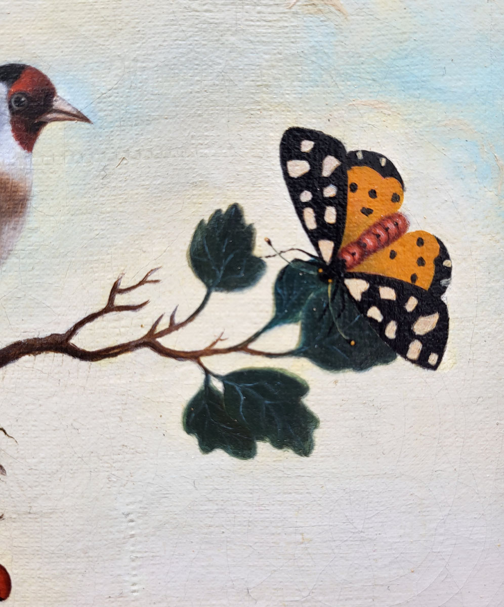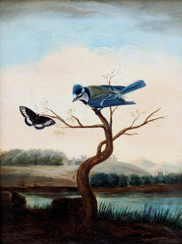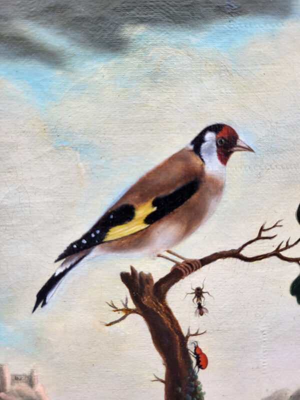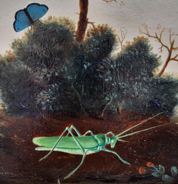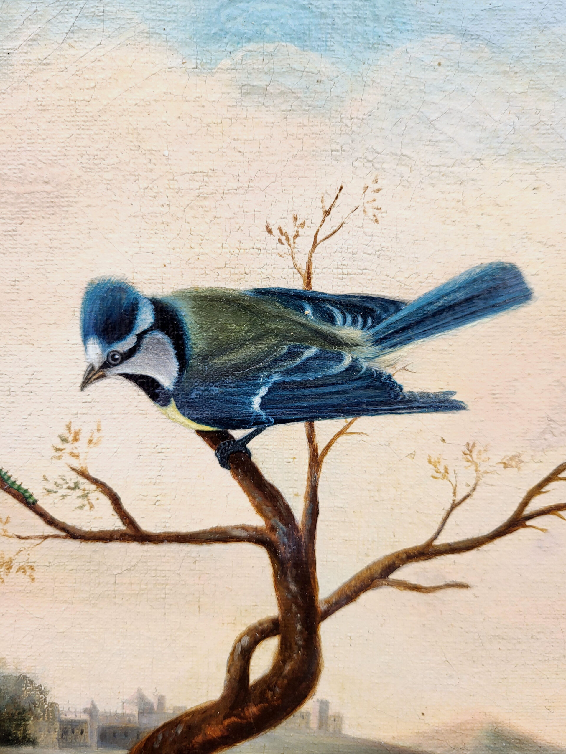 Trois très belle huiles repésentants divers oiseaux et insectes avec avec en arrière plan des paysages.