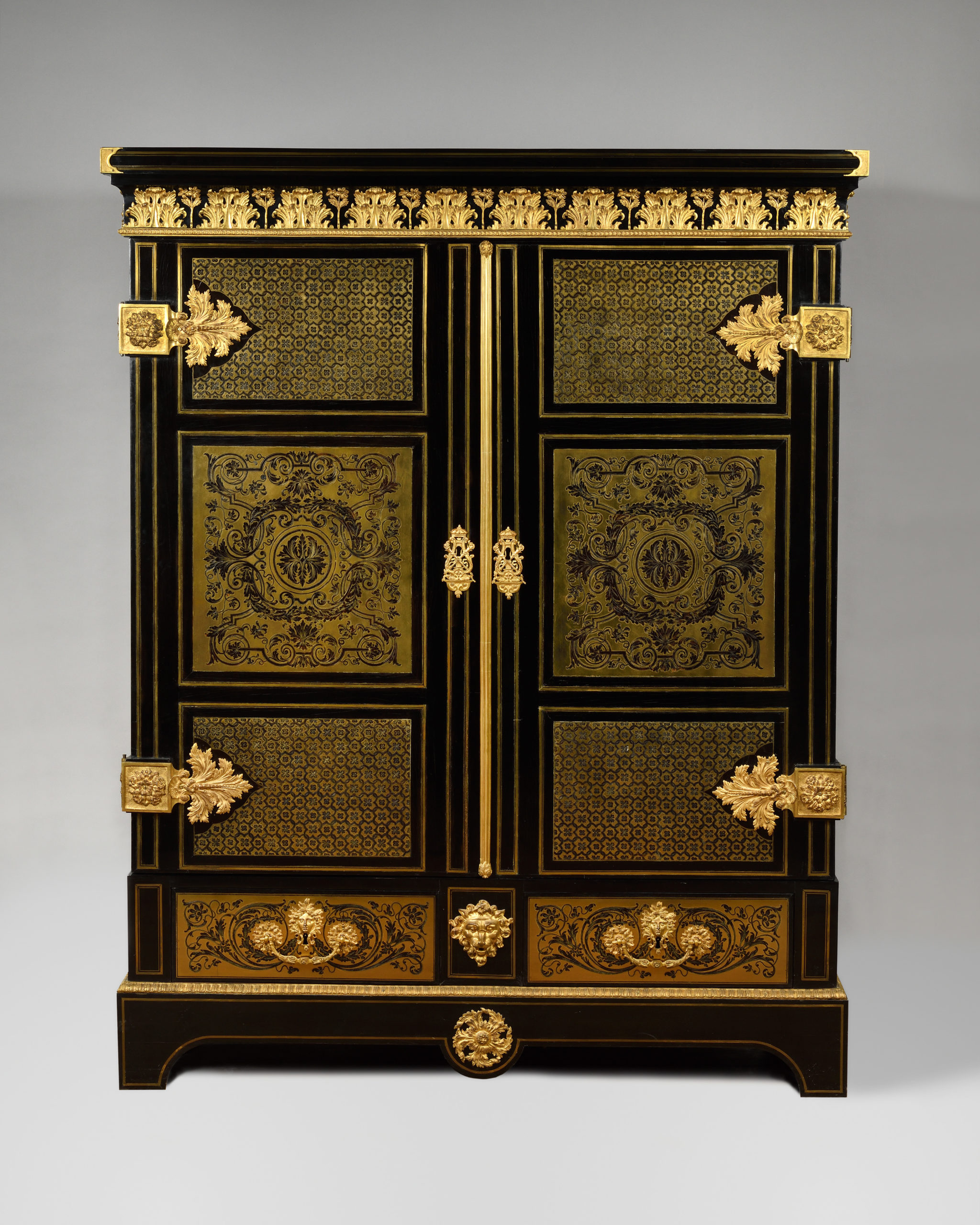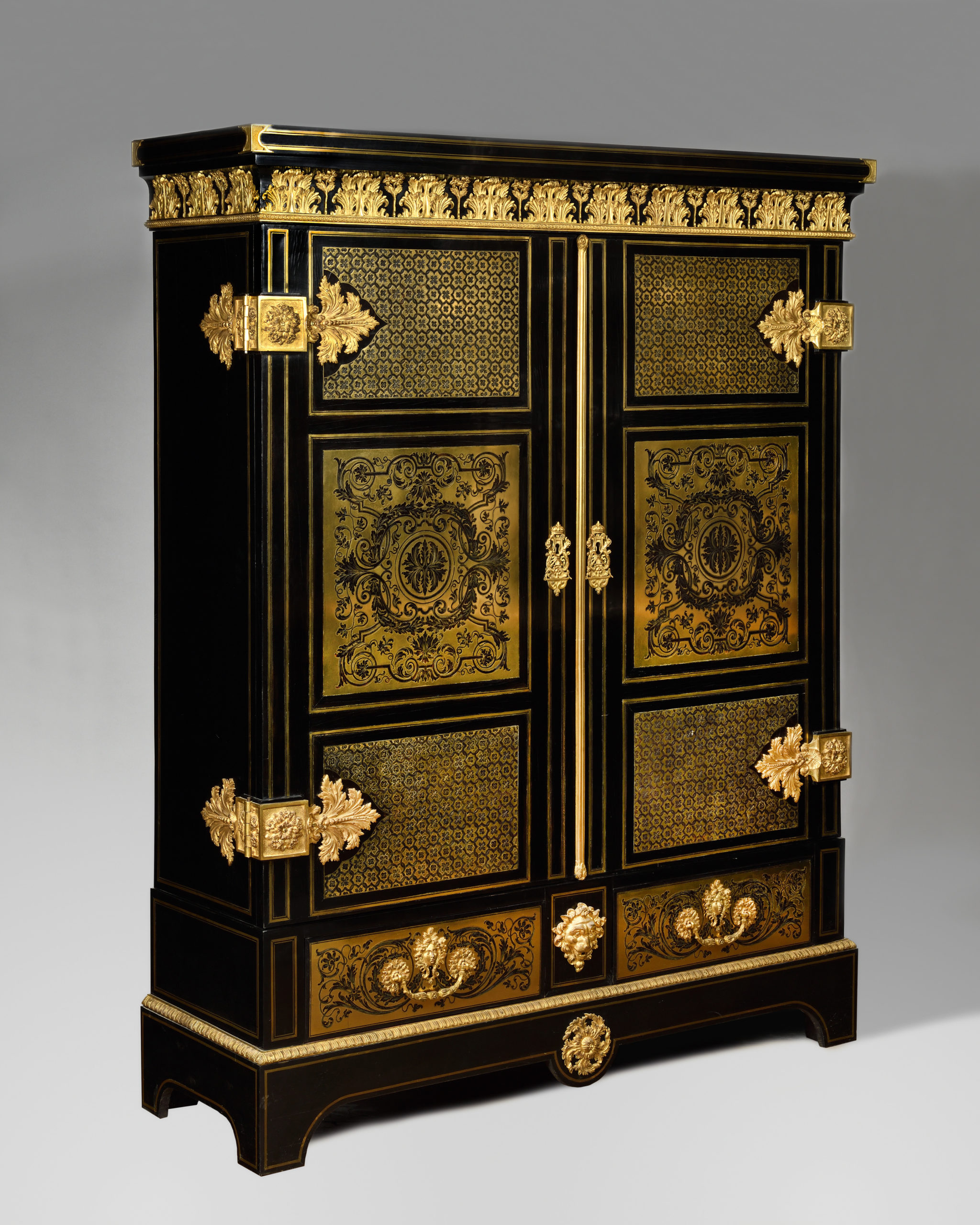 partie et contre-partie, agrémentées d’une riche ornementation de bronze ciselé doré. Plaquées de bois noirci, à décor d’une riche ornementation de bronze doré tels que frise sous la corniche, importantes charnières, serrures, bronzes en applique et filets. Les portes entièrement ornées de marqueterie Boulle en écaille de tortue et laiton doré.