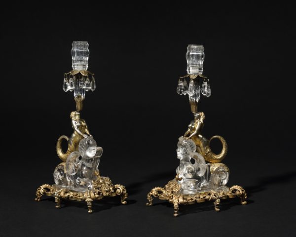 Pair of candlesticks in rock crystal and vermeil. Figure of sirens riding chimeras.