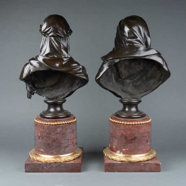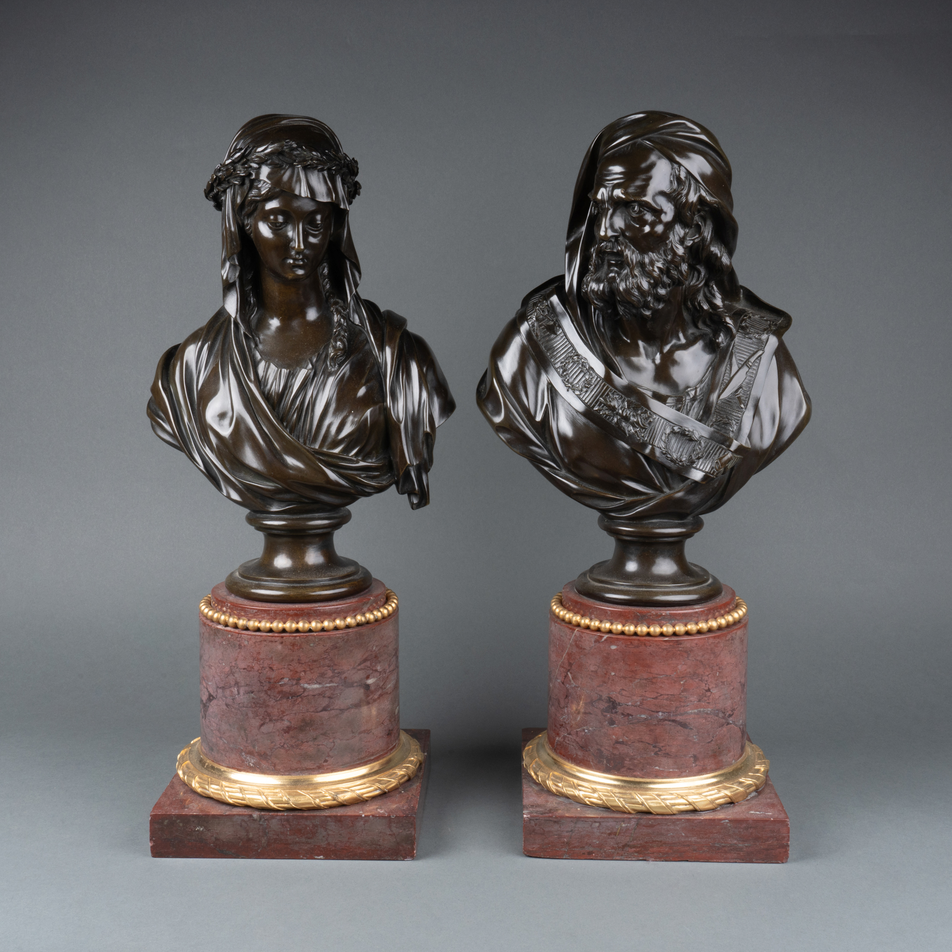 Paire de bronzes à patine brune , bustes d’Iphigénie et Chrysés , supportés par des socles ronds en marbre rouge griotte , cerclés d’un perlé et d’une large frise en bronze doré , sur une base carrée .