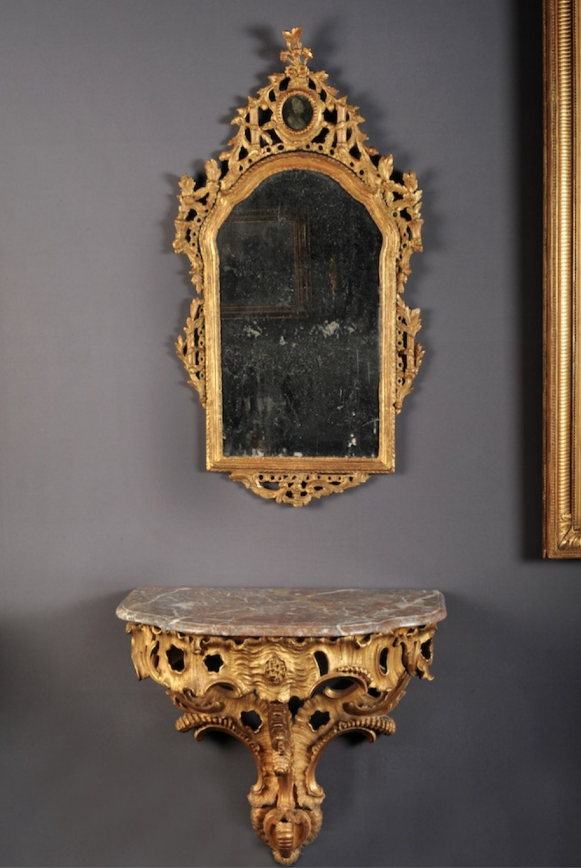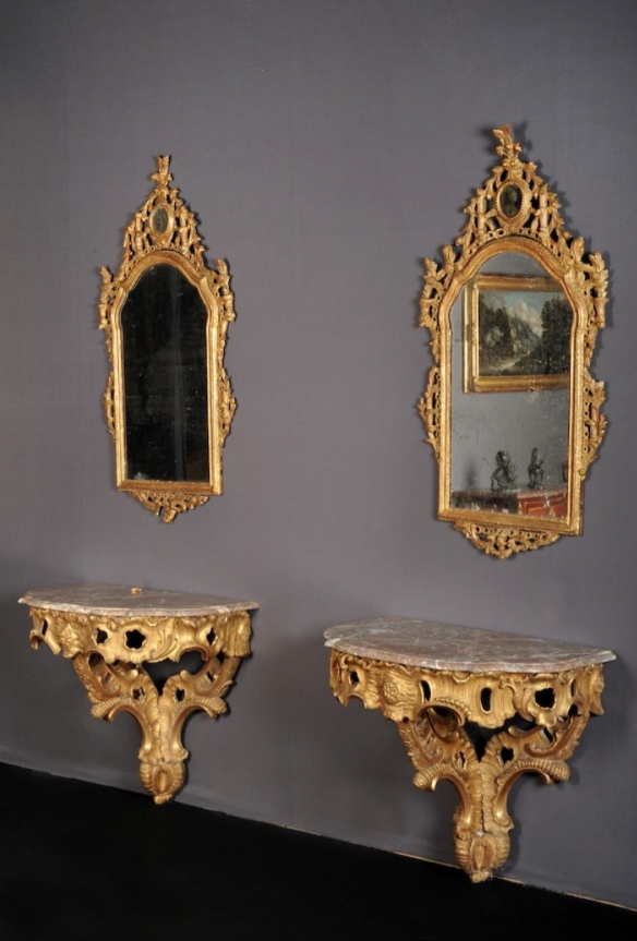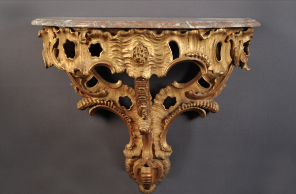 Paire de consoles d’applique en bois doré à décor feuillagé et frises de perles.
