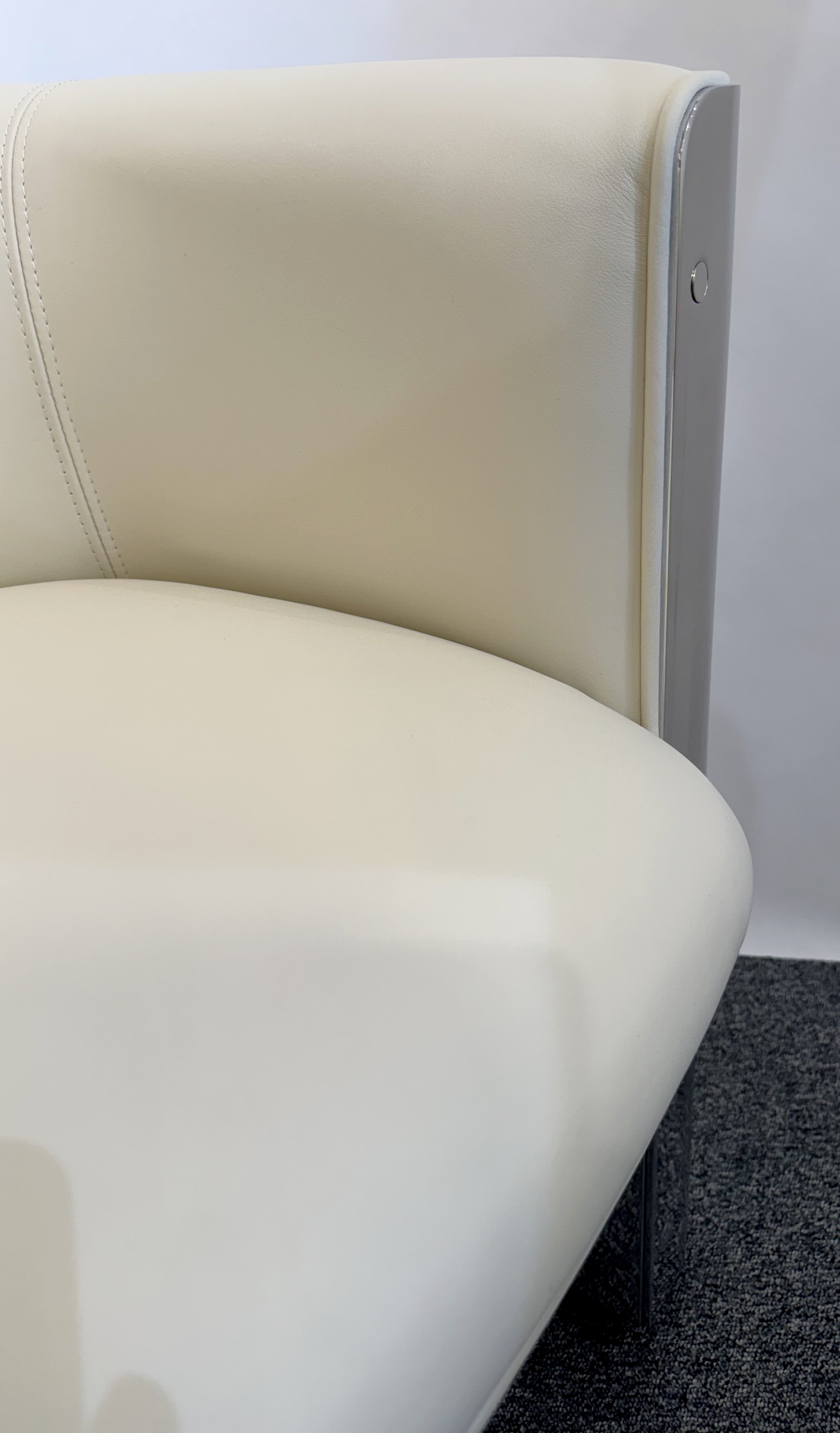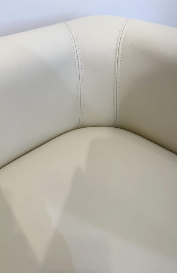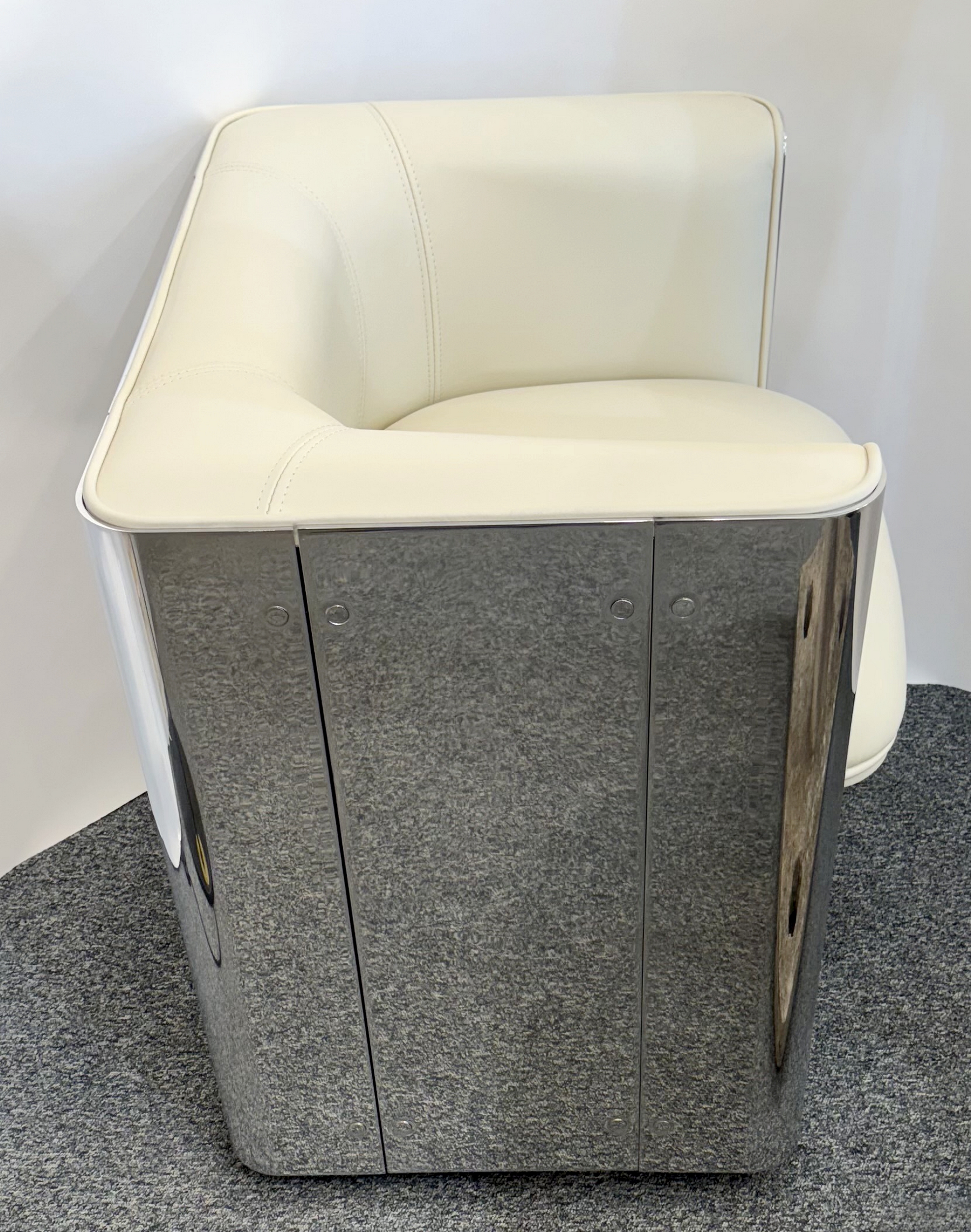 L’aluminium a été repoli, la garniture entièrement refaite et recouverte de cuir blanc cassé avec passepoils et piqûres sellier.