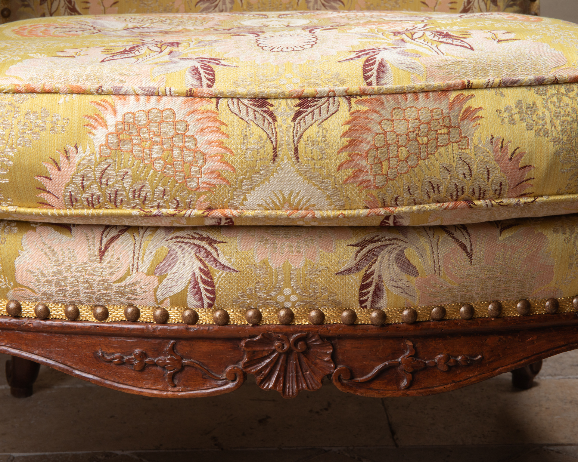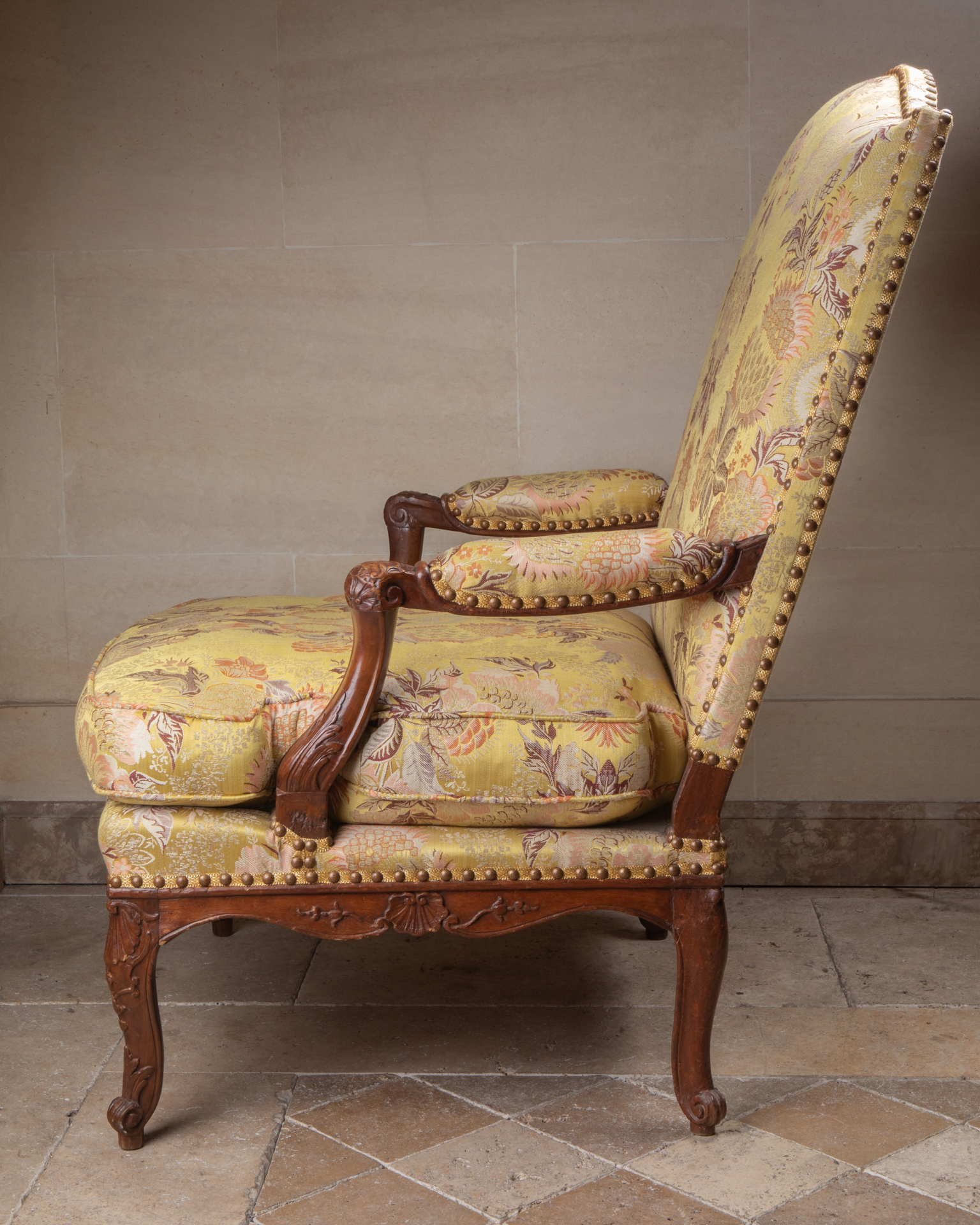 Paire de grands sièges en noyer ciré , assises basses , à dossier plein .Sur toutes les faces , les ceintures chantournées et moulurées s’agrémentent de manière sobre d’une coquille centrale entourée de feuillages. Les pieds cambrés surmontés d’une feuille d’acanthe se terminent par un enroulement feuillagé ; les accotoirs ornés aussi d’une feuille d’acanthe.