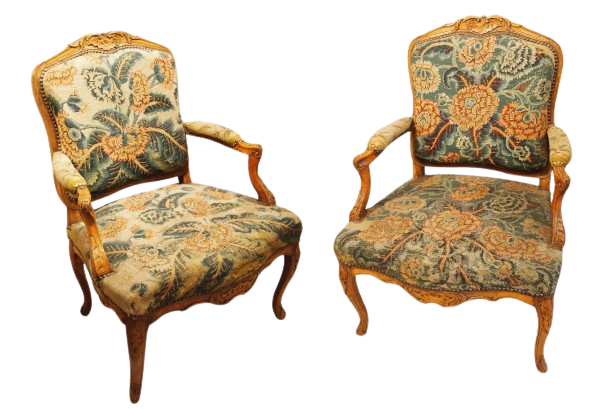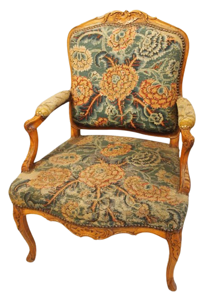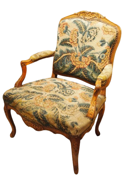 Notre modèle possède un haut dossier, mais l’accoudoir est moins haut que les fauteuils Louis XIV.