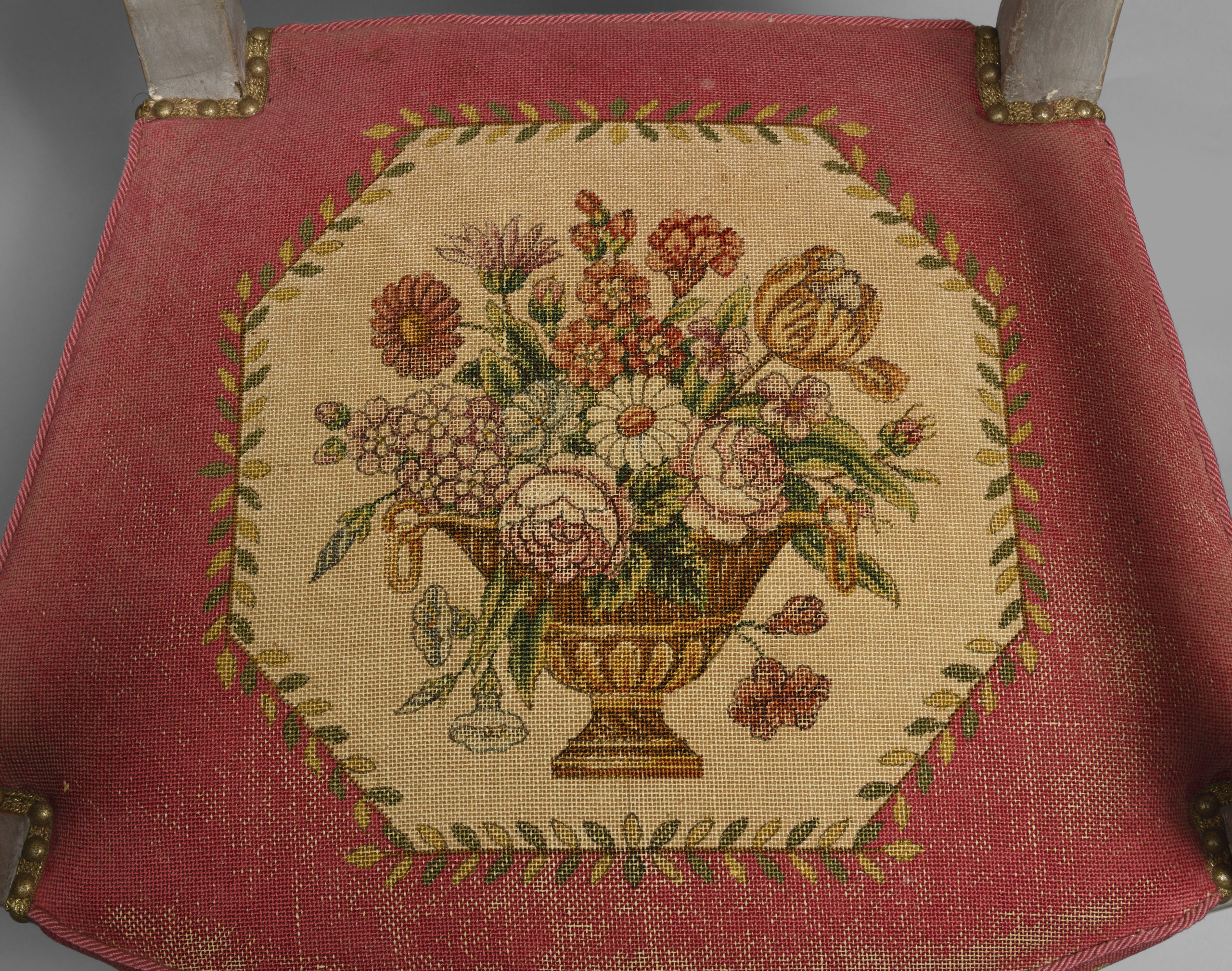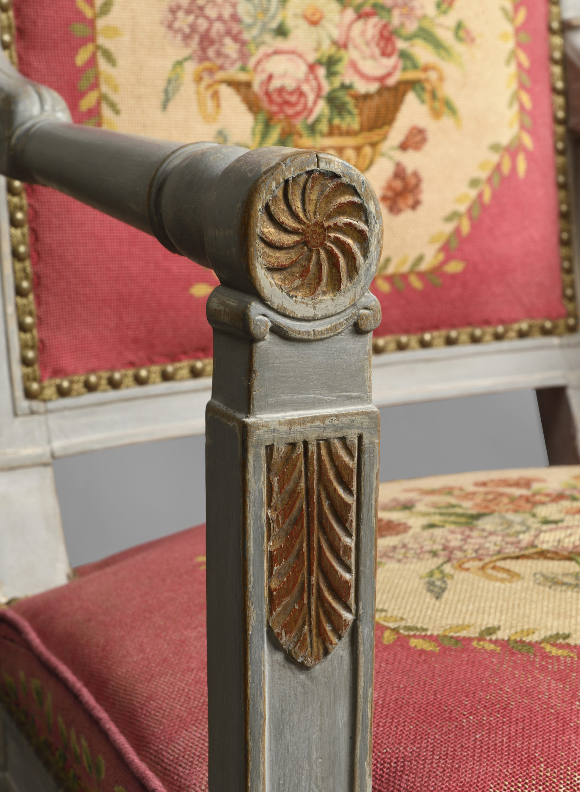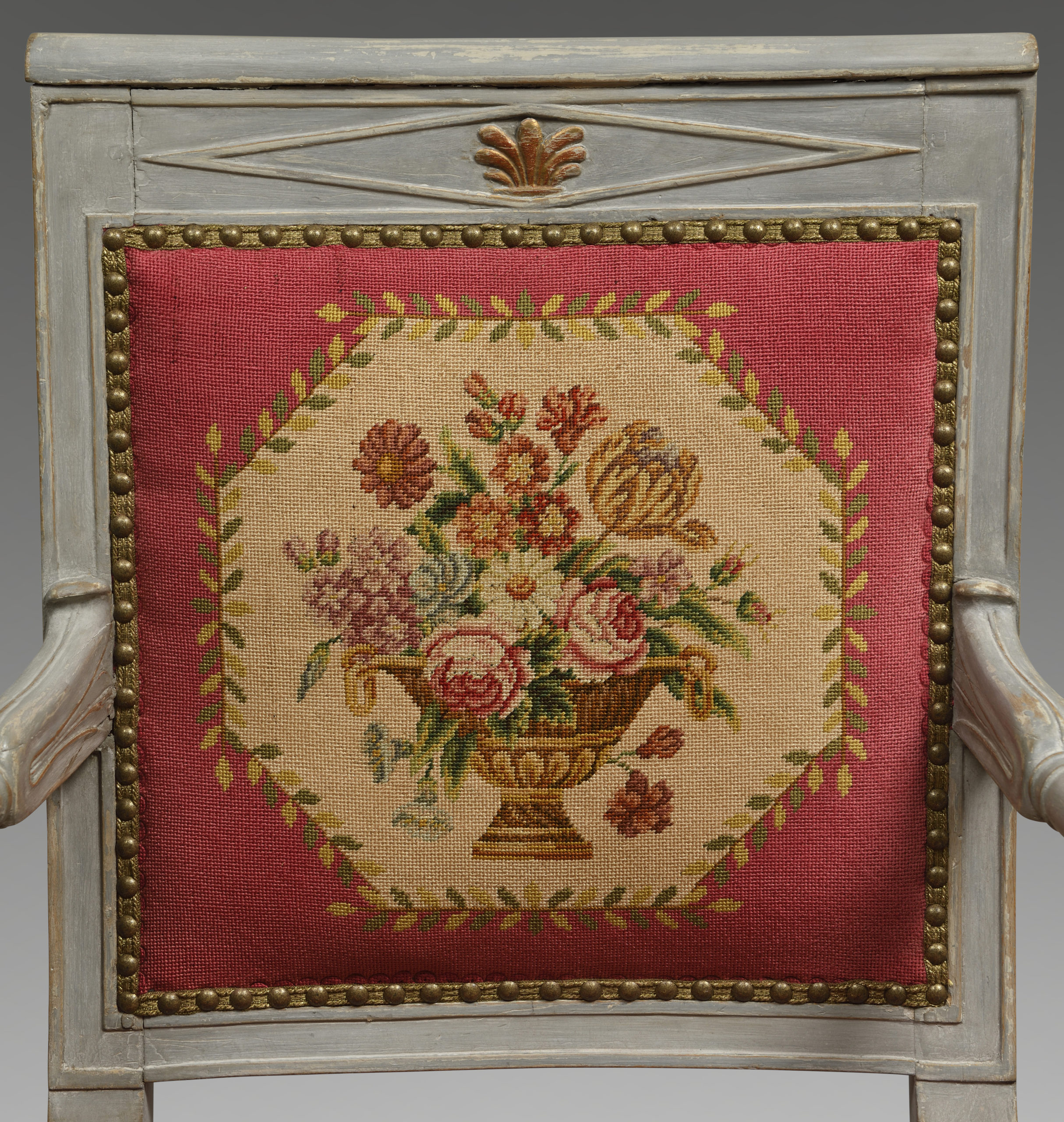 Paire de fauteuils en hêtre laqué gris, dossier droit, pieds gaine évasés au bout, pieds en sobre ornementation de rosaces, palmettes et losanges. Fauteuils recouverts de tapisseries de vases fleuris sur fond rouge.