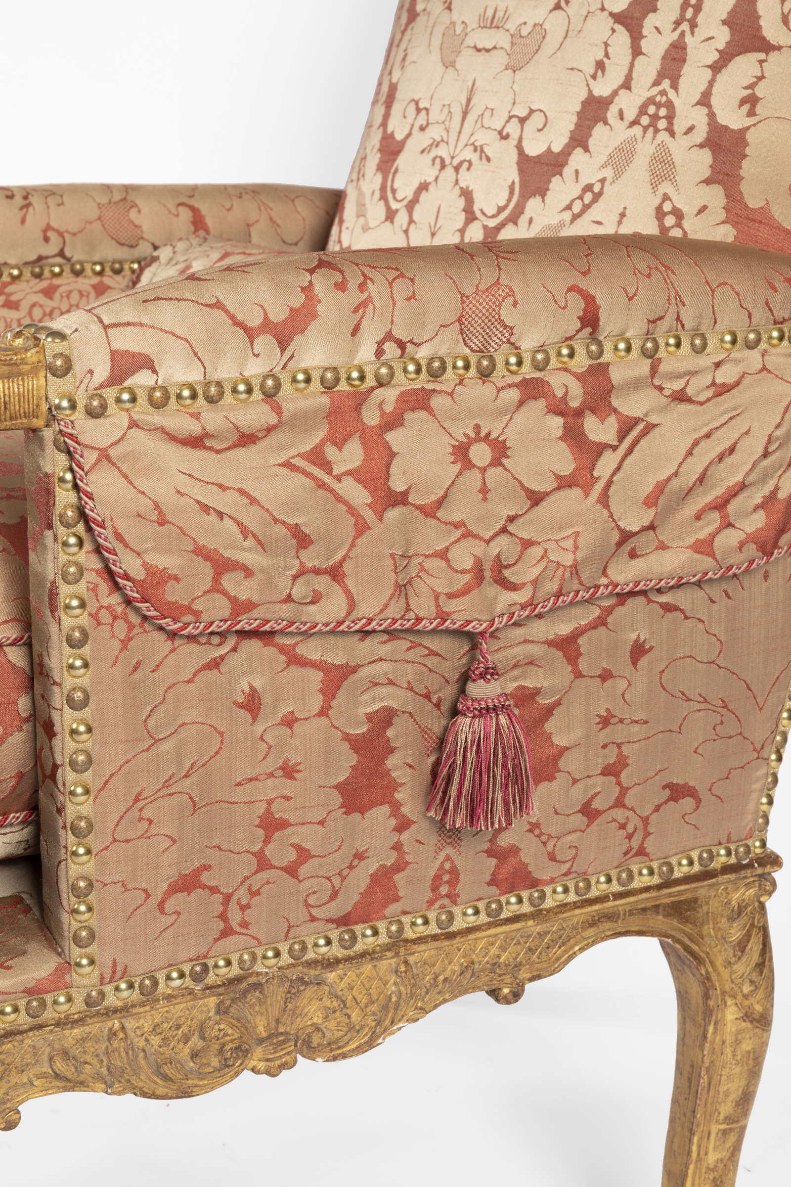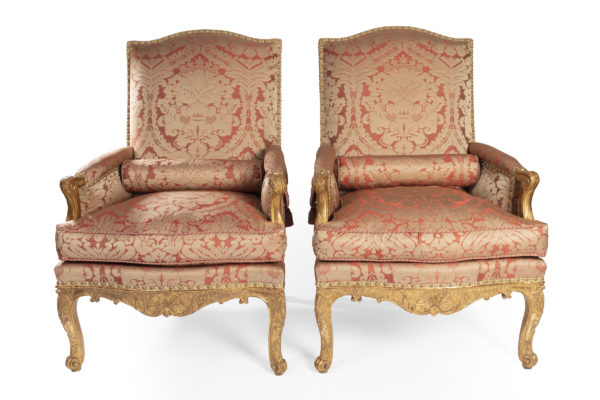 Paire de bergères en bois sculpté et doré , dossier à la Reine , la ceinture avant mouvementée et droites sur les côtés sot sculptées sur fond de treillis d’une coquille centrée autour de feuillages ,les pieds cambrés surmontés d’une feuille d’acanthe se terminent par un enroulement feuillagé , les accotoirs sculptés d’une coquille .