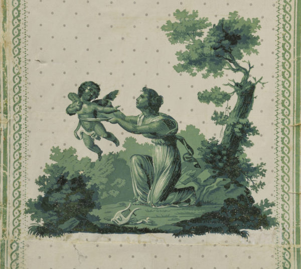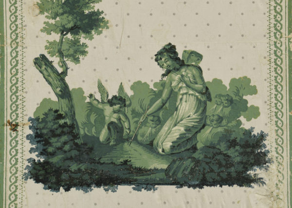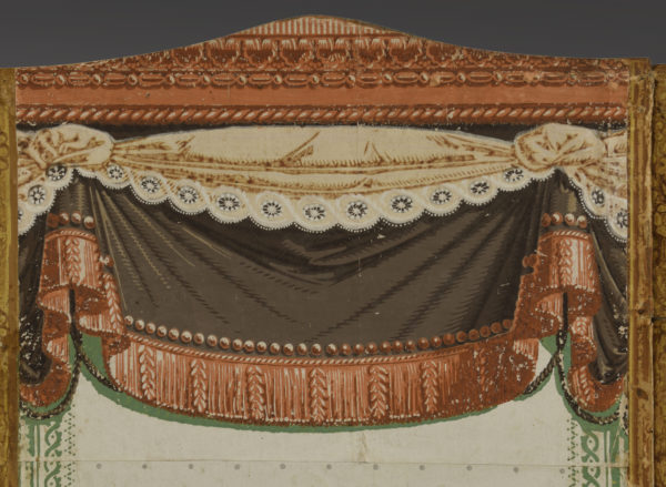 Paravent en papier peint à six pans. Décors de personnages et d’angelots, de bouquets et de rideaux de théâtre.
