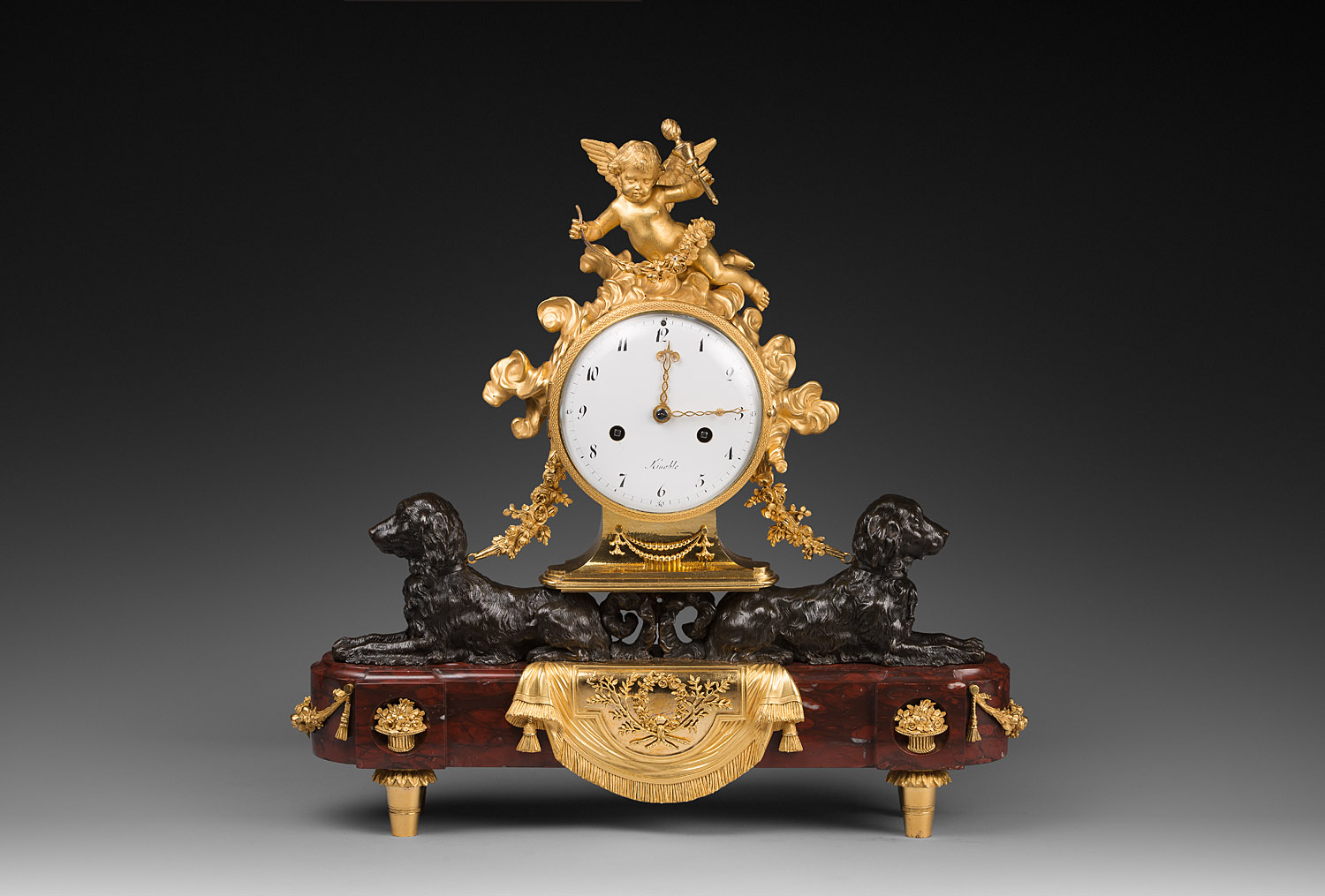 Elle repose sur deux épagneuls en bronze patiné allégorie de la fidélité, le cadran surmonté d’un putto tenant une guirlande de fleurs sur des nuées symbole de l’Amour.