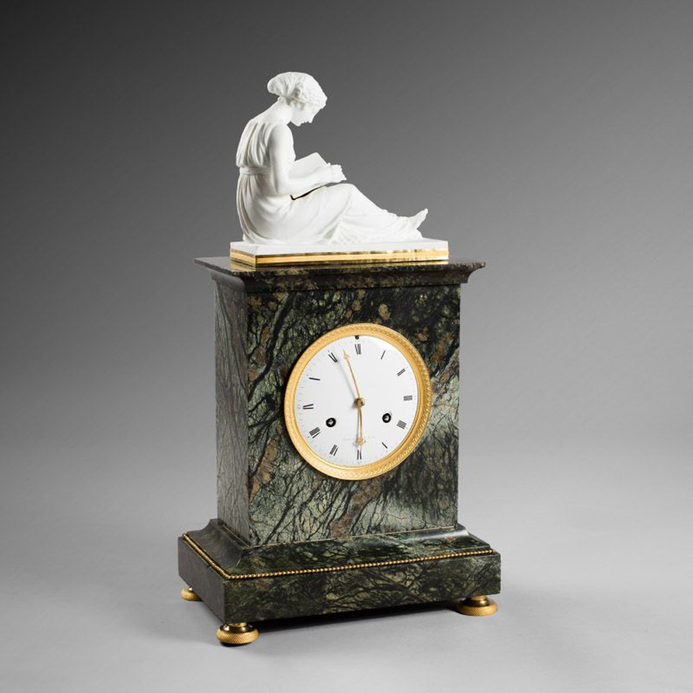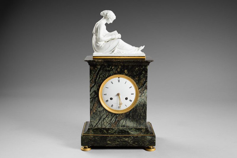 Surplombée d’une statuette représentant une jeune fille lisant.