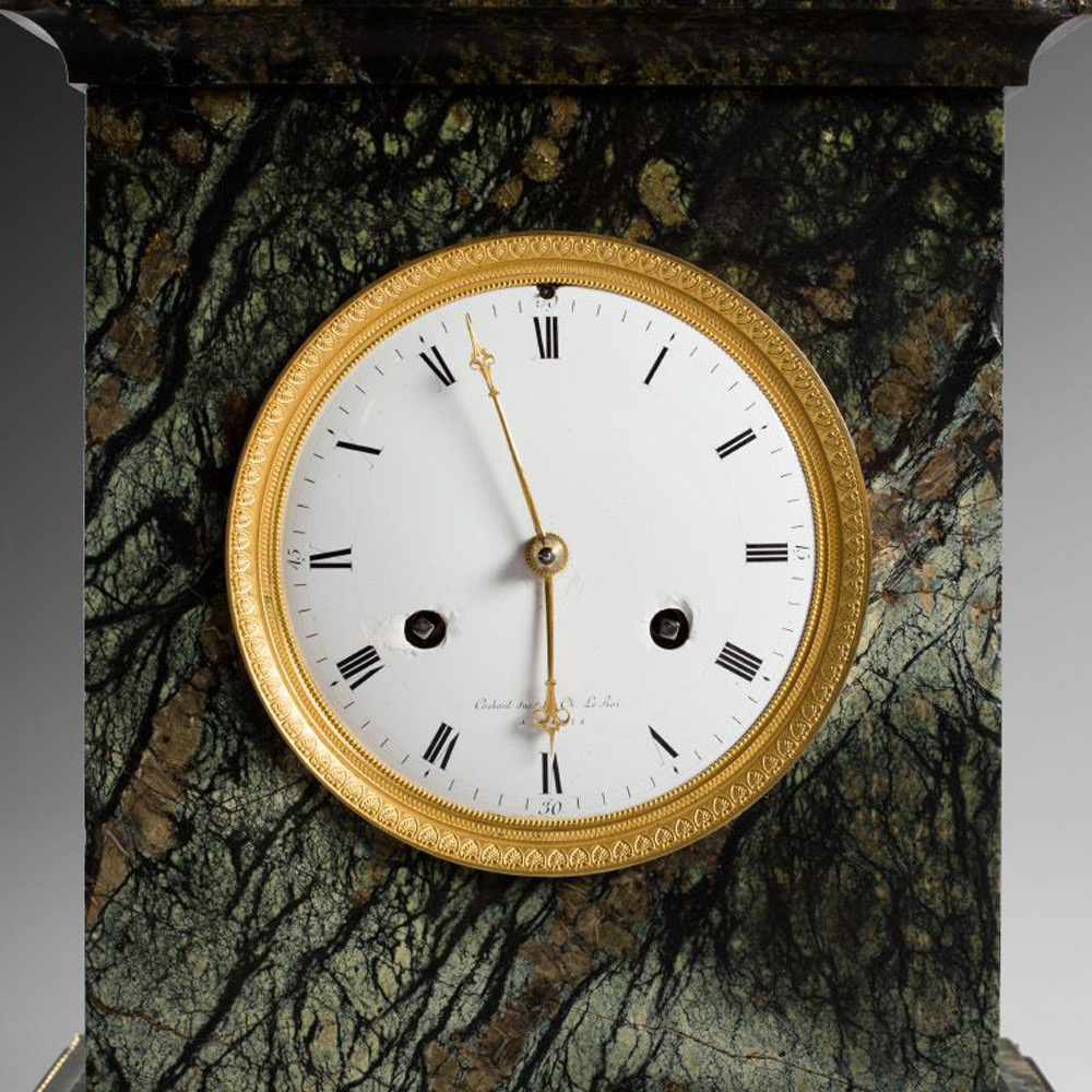 Le cadran est ajouré d’un fin liseré de bronze doré et ciselé.