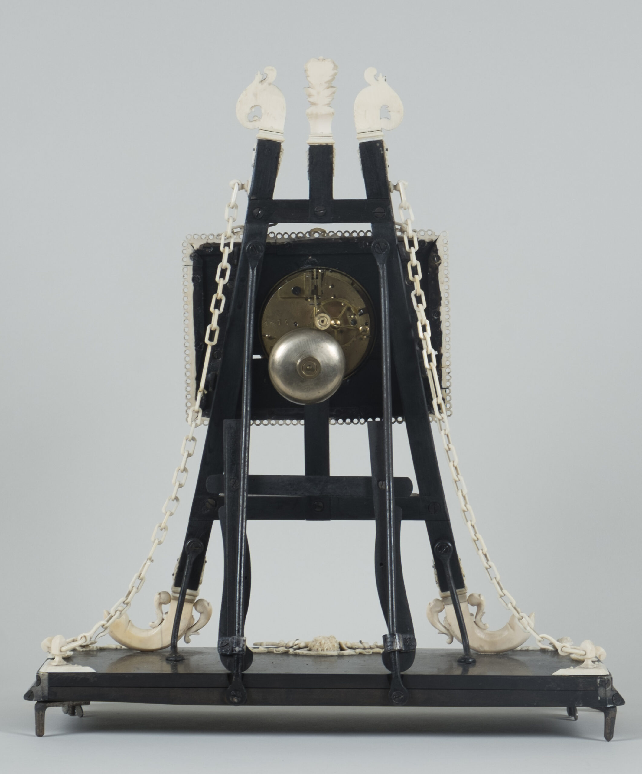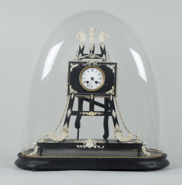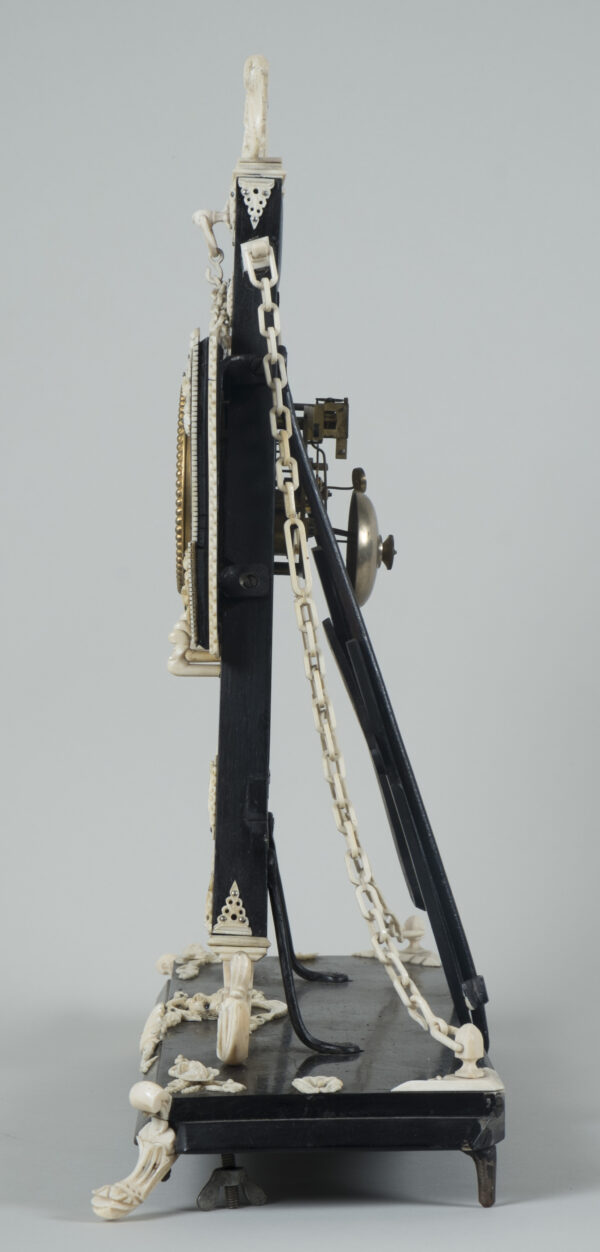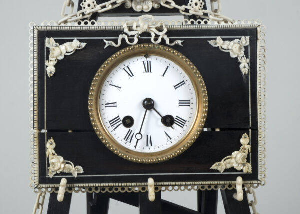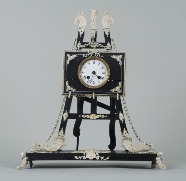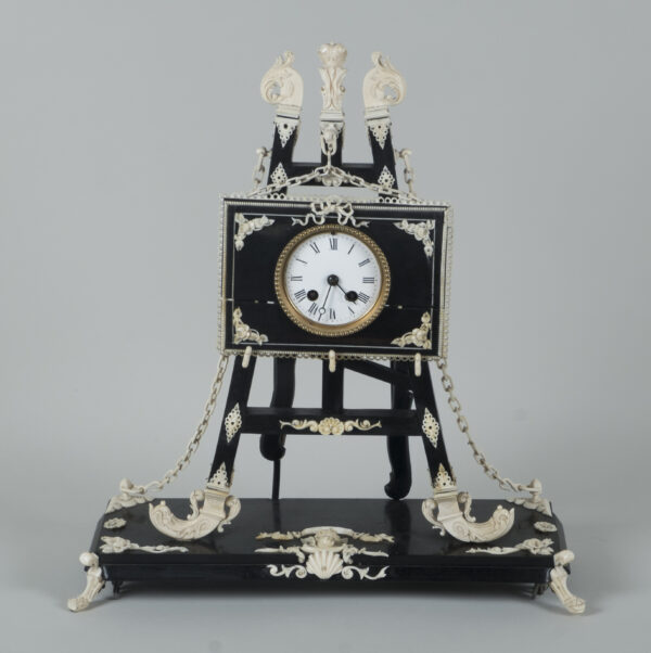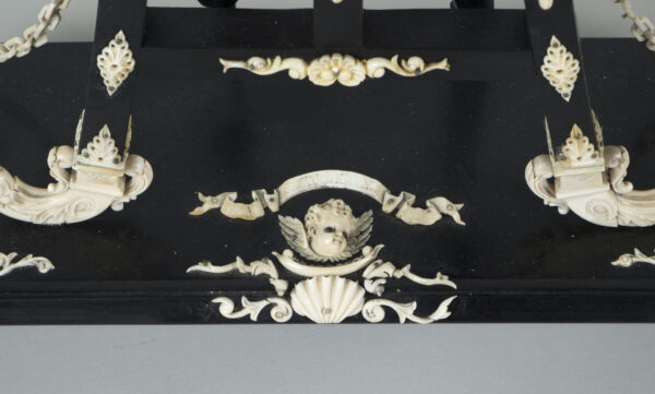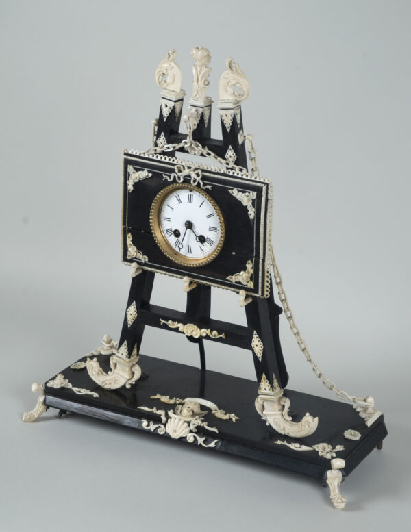 pendule formant chevalet supportant un tableau, à décors d’acanthes, coquilles, putti, fleurs, perles et chainettes en ébène et os.