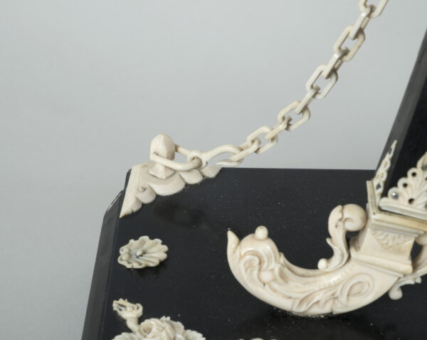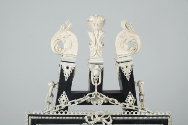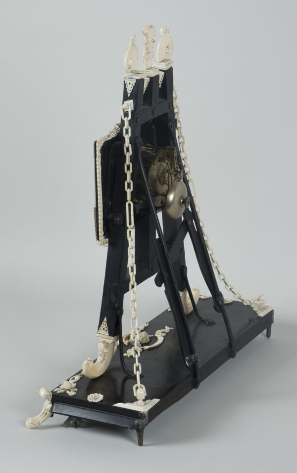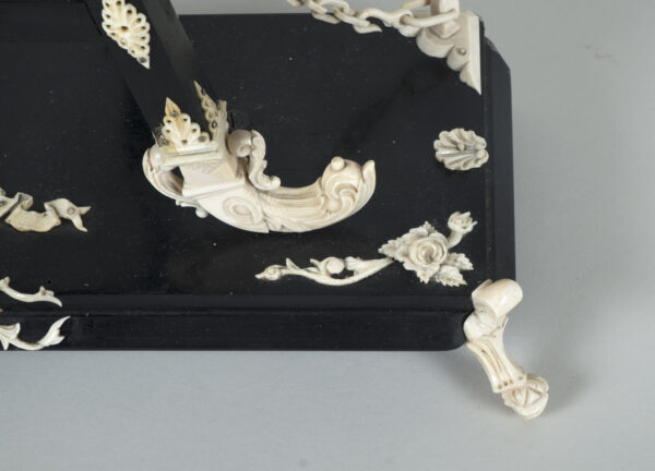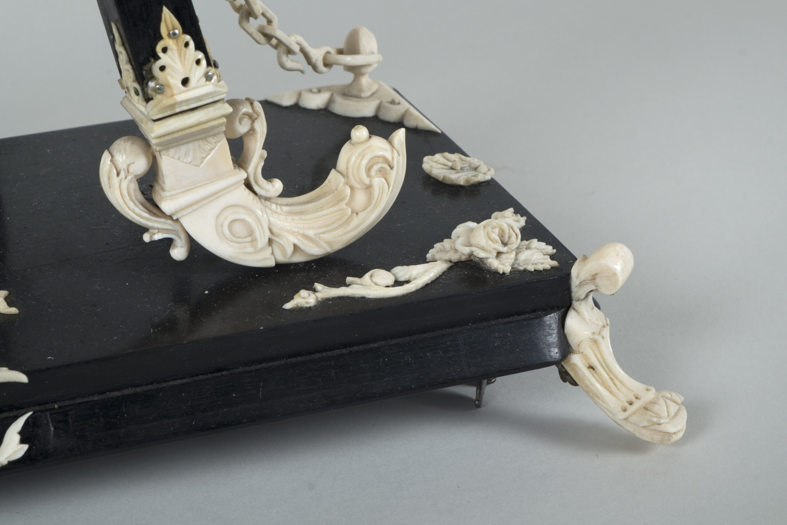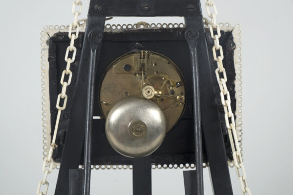 pendule formant chevalet supportant un tableau, à décors d’acanthes, coquilles, putti, fleurs, perles et chainettes en ébène et os.
