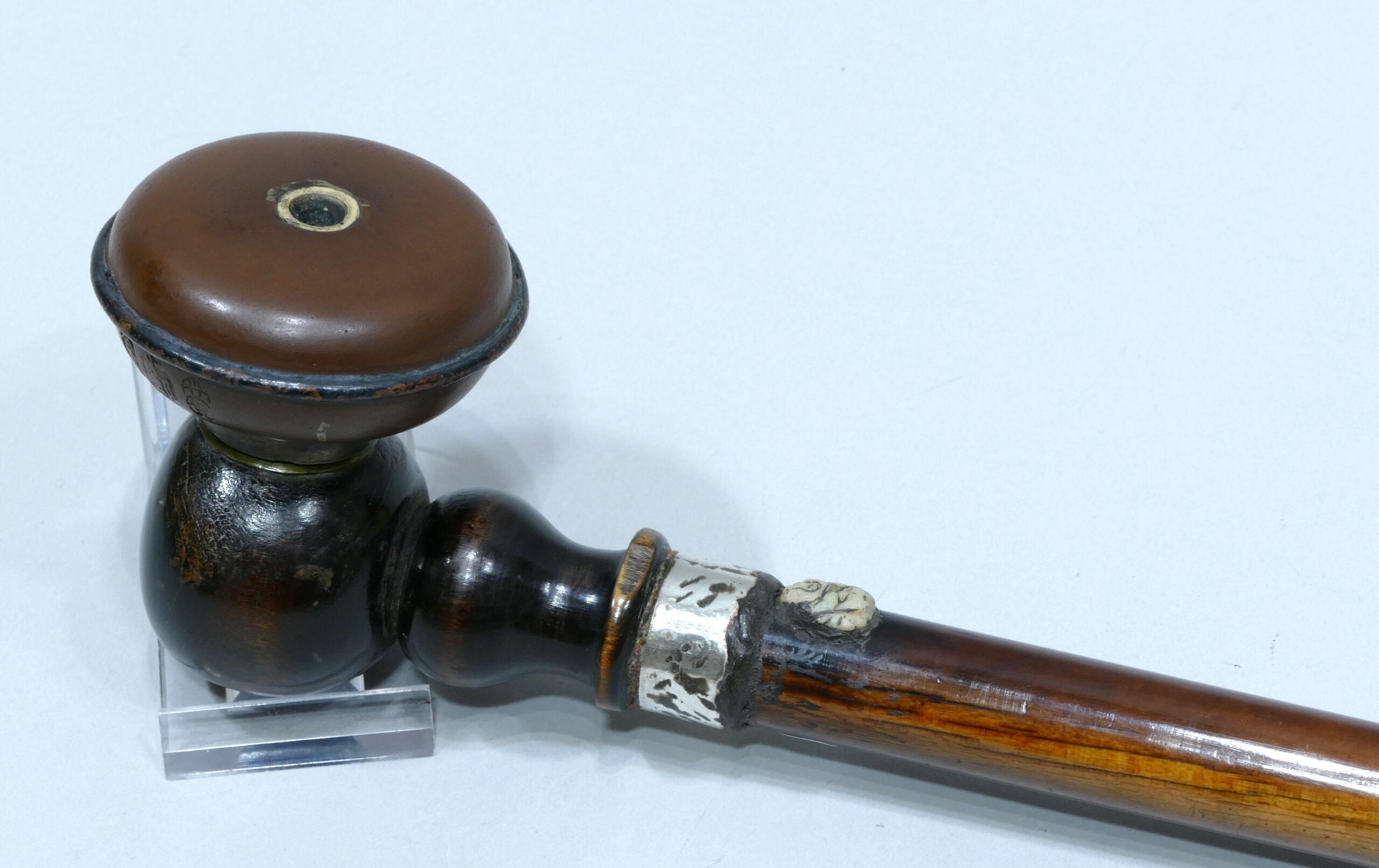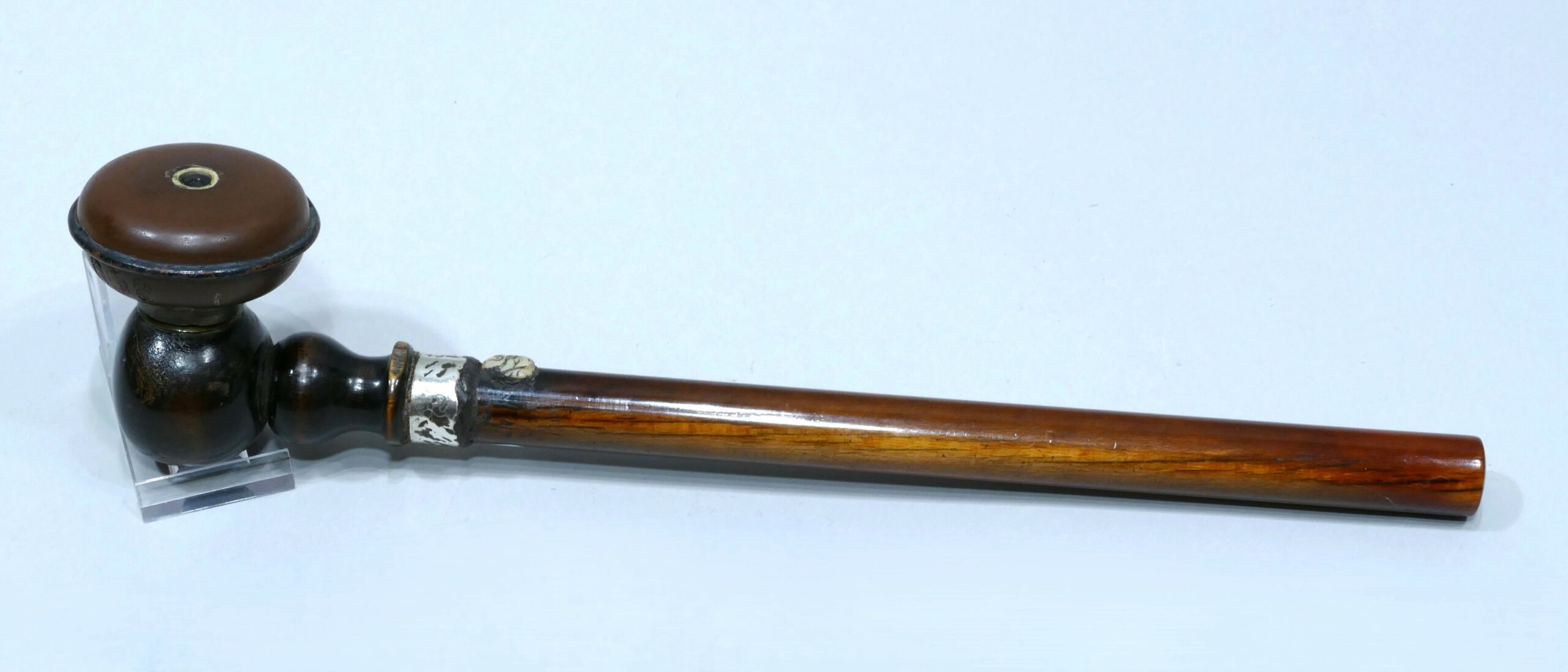Pipe courte à opium avec tuyau en ivoire fortement patiné comprenant une pastille en pierre dure représentant un Bouddha.