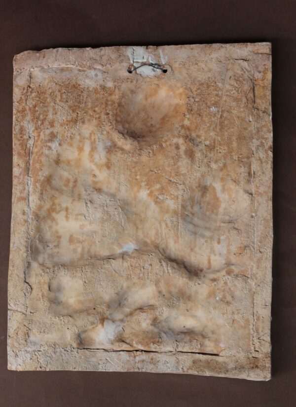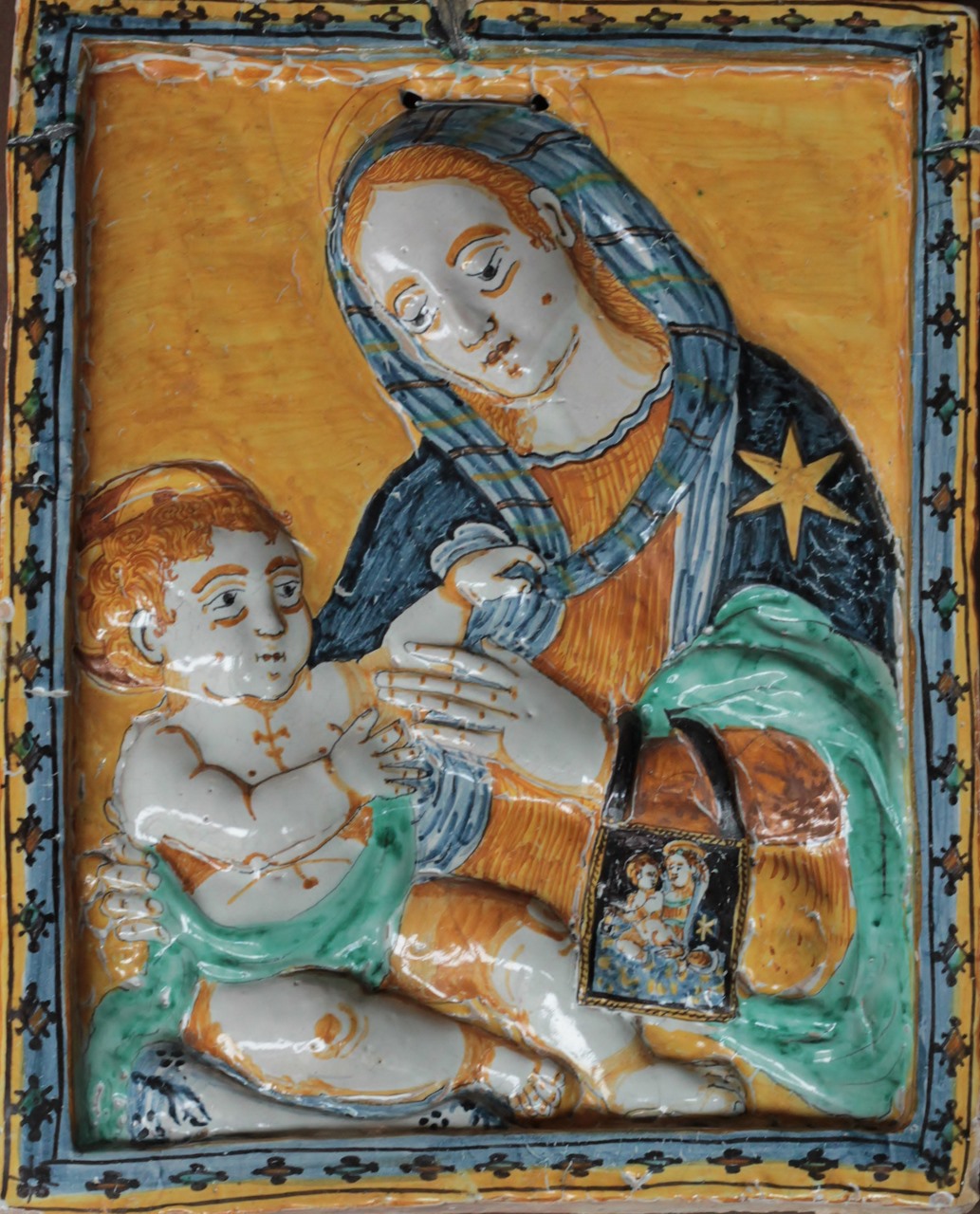 Rectangular plate in Deruta earthenware with polychrome decoration of a Madonna and Child in bas-relief after a composition by Benedetto da Maiano. Border imitating a frame.