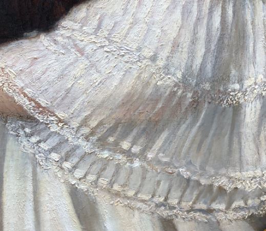 Le fond, traité dans des nuances de marron foncé fait ressortir la carnation si blanche de la jeune fille. L’éclairage, venant du côté, ajoute de la douceur. Tout est fait pour donner au spectateur ce sentiment : le regard, le demi-sourire, la pose des bras et surtout des mains, la délicatesse de la dentelle, ajoute de la fragilité.