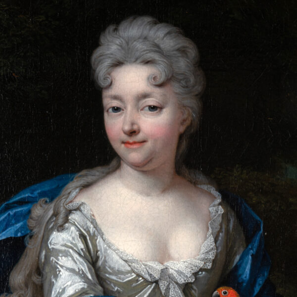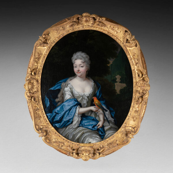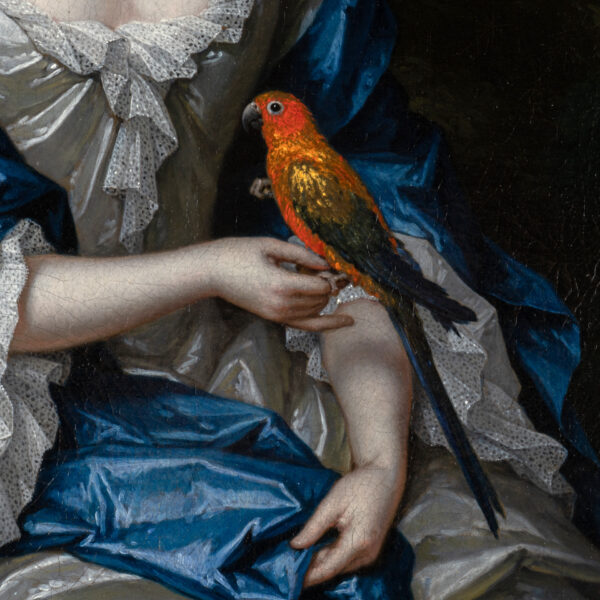 Charmant portrait d’une femme de qualité tenant un perroquet .