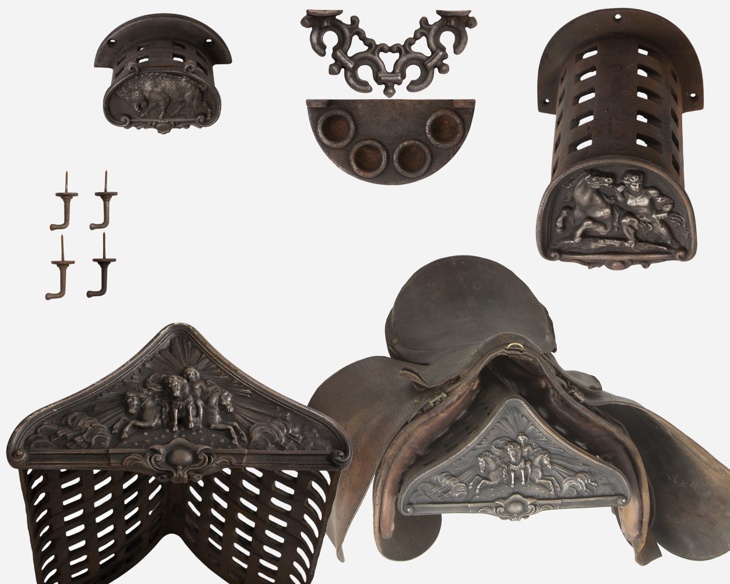 Bel ensemble d’écurie de château en fonte pour quatre chevaux à décor de chasse.