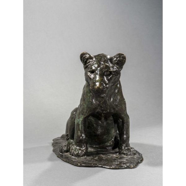 Pour la réalisation de ses modèles en bronze, Godchaux accorde une place importante au dessin anatomique avec relevé métrique des proportions consignées sur des croquis. Son talent réside dans un sens aigu de l’observation non seulement des formes mais aussi du comportement de l’animal choisi. Les félins qu’il a aimé représenter dans toutes les matières (cire, plâtre, terre cuite, bronze, bois, terre crue) sont souvent empreints de grâce tels les Lionceaux jouant, le Lionceau rongeant son os, la Lionne et son petit. Notre Lionceau assis, assis sur ses deux pattes arrière, la tête inclinée vers l’avant n’échappe pas à la règle. Son attitude presque familière dégage une forme d’intimité rassurante avec le spectateur.