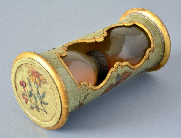 Sablier à deux fioles dans sa monture en Arte Povera datable vers 1720.