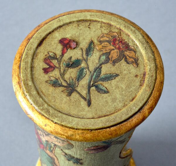 La monture en bois polychromé et doré comporte deux bases circulaires à décor de fleurs.