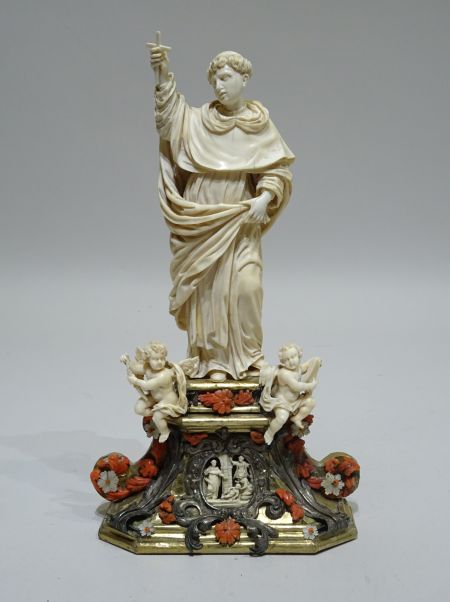 Statue de saint Vincent brandissant la croix avec à ses pieds et de part et d’autre deux angelots, l’un portant un livre, l’autre muni d’un arc.