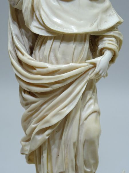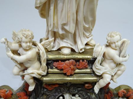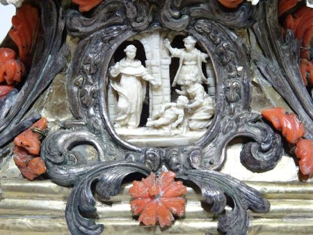 The wooden base is covered with brass leaves with an ivory motive evocating the scene of the Christ descent in the grave surrounded by silver palm leaves and various pieces of coral and mother of pearl.