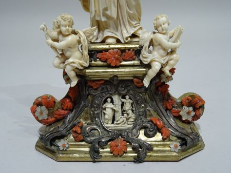 L’ensemble est posé sur un piédestal pyramidal recouvert de feuilles de laiton avec, au centre, une scène de descente au tombeau en ivoire sculpté ceint d’un décor de palmes en argent et de motifs divers en corail et nacre.
